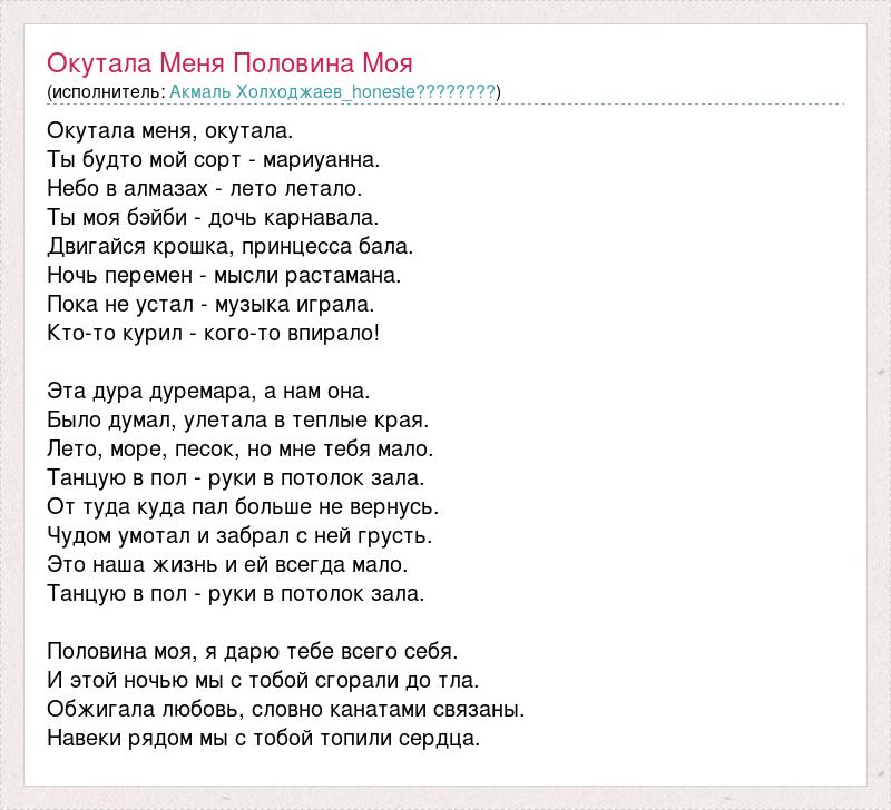 Окутала меня, окутала. Ты будто мой сорт - мариуанна. Небо в алмазах - лето летало. Ты моя бэйби - дочь карнавала. Двигайся крошка, принцесса бала. Ночь перемен - мысли растамана. Пока не устал - музыка играла. Кто-то курил - кого-то впирало! Эта дура дуремара, а нам она. Было думал, улетала в теплые края. Лето, море, песок, но мне тебя мало. Танцую в пол - руки в потолок зала. От туда куда пал больше не вернусь. Чудом умотал и забрал с ней грусть. Это наша жизнь и ей всегда мало. Танцую в пол - руки в потолок зала. Половина моя, я дарю тебе всего себя. И этой ночью мы с тобой сгорали до тла. Обжигала любовь, словно канатами связаны. Навеки рядом мы с тобой топили сердца.