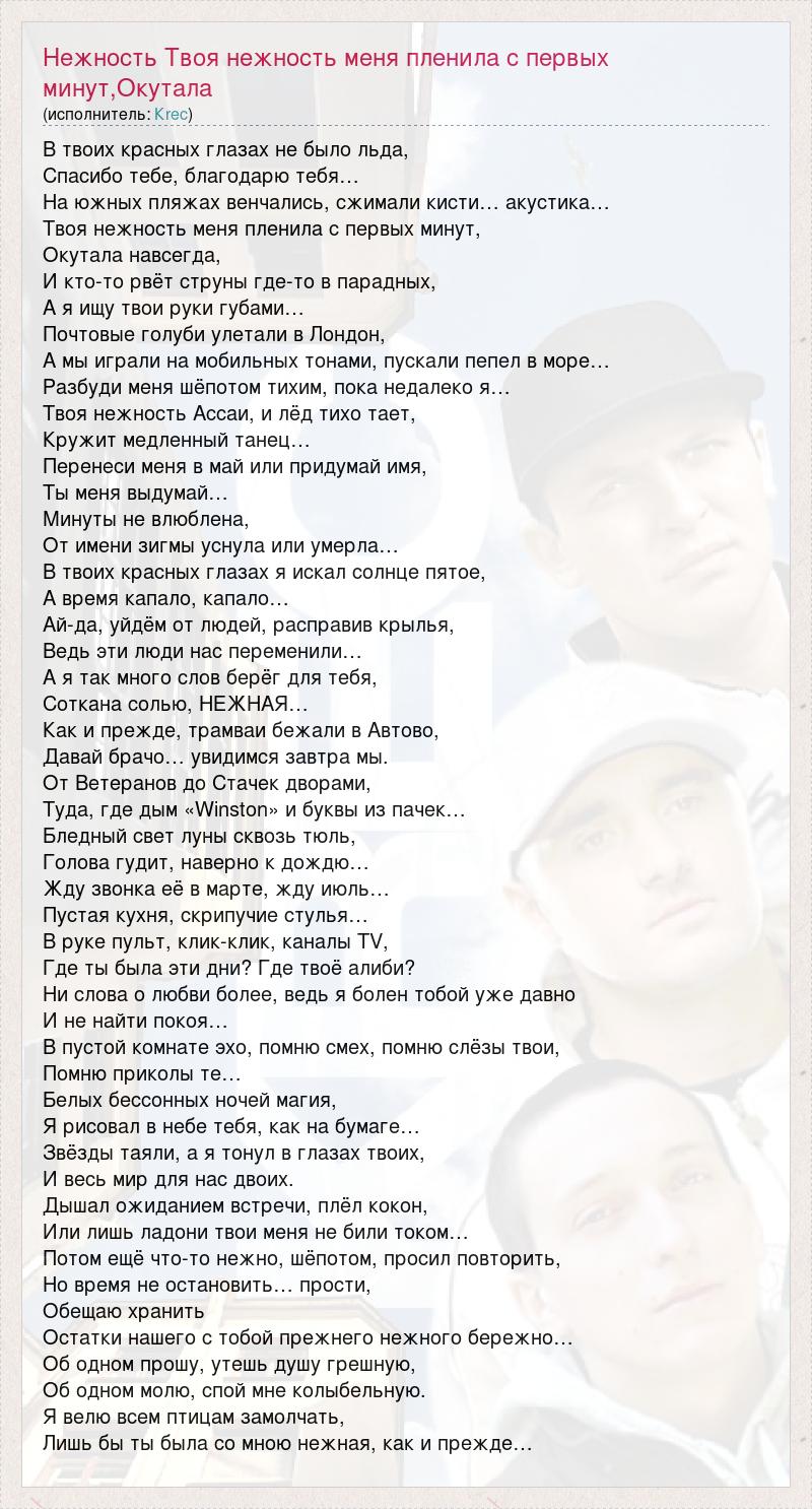В твоих красных глазах не было льда, Спасибо тебе, благодарю тебя… На южных пляжах венчались, сжимали кисти… акустика… Твоя нежность меня пленила с первых минут, Окутала навсегда, И кто-то рвёт струны где-то в парадных, А я ищу твои руки губами… Почтовые голуби улетали в Лондон, А мы играли на мобильных тонами, пускали пепел в море… Разбуди меня шёпотом тихим, пока недалеко я… Твоя нежность Ассаи, и лёд тихо тает, Кружит медленный танец… Перенеси меня в май или придумай имя, Ты меня выдумай… Минуты не влюблена, От имени зигмы уснула или умерла… В твоих красных глазах я искал солнце пятое, А время капало, капало… Ай-да, уйдём от людей, расправив крылья, Ведь эти люди нас переменили… А я так много слов берёг для тебя, Соткана солью, НЕЖНАЯ… Как и прежде, трамваи бежали в Автово, Давай брачо… увидимся завтра мы. От Ветеранов до Стачек дворами, Туда, где дым «Winston» и буквы из пачек… Бледный свет луны сквозь тюль, Голова гудит, наверно к дождю… Жду звонка её в марте, жду июль… Пустая кухня, скрипучие стулья… В руке пульт, клик-клик, каналы TV, Где ты была эти дни? Где твоё алиби? Ни слова о любви более, ведь я болен тобой уже давно И не найти покоя… В пустой комнате эхо, помню смех, помню слёзы твои, Помню приколы те… Белых бессонных ночей магия, Я рисовал в небе тебя, как на бумаге… Звёзды таяли, а я тонул в глазах твоих, И весь мир для нас двоих. Дышал ожиданием встречи, плёл кокон, Или лишь ладони твои меня не били током… Потом ещё что-то нежно, шёпотом, просил повторить, Но время не остановить… прости, Обещаю хранить Остатки нашего с тобой прежнего нежного бережно… Об одном прошу, утешь душу грешную, Об одном молю, спой мне колыбельную. Я велю всем птицам замолчать, Лишь бы ты была со мною нежная, как и прежде…