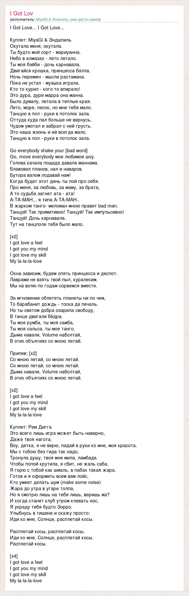 I Got Love... I Got Love... Куплет: MiyaGi & Эндшпиль Окутала меня, окутала. Ты будто мой сорт - мариуанна. Небо в алмазах - лето летало. Ты моя бэйби - дочь карнавала. Двигайся крошка, принцесса балла. Ночь перемен - мысли растамана. Пока не устал - музыка играла. Кто то курил - кого то впирало! Это дура, дури марра она манна. Было думалу, летала в теплые края. Лето, море, песок, но мне тебя мало. Танцую в пол - руки в потолок зала. Оттуда куда пал больше не вернусь. Чудом умотал и забрал с ней грусть. Это наша жизнь и ей всегда мало. Танцую в пол - руки в потолок зала. Go everybody shake your [bad word] Go, move everybody мое любимое шоу. Голова качала пощада давала маннама. Блавовал планов, нал и наваров. Бутора валом подавай нам! Когда будет этот день ты пой про себя. Про меня, за любовь, за маму, за брата, А то судьба загнет ата - ата! А-ТА-МАН... я типа А-ТА-МАН.. В жарком танго- меломан мною правит bad man. Танцуй! Так примитивно! Танцуй! Так импульсивно! Танцуй! Дочь карнавала. Тут на танцполе тебя было мало. [x2] I got love a feel I got you my mind I got love my skill My la-la-la-love Окна зависим, будем опять принцесса и деспот. Лаврами не взять твой пыл, куралесим. Мы на волю по годам сорвемся вместе. За мгновение облететь планеты ни по чем, То барабанит дождь - тоска да печаль. Но ты светом добра озарила свободу, В танце двигали бёдра. Ты моя румба, ты моя самба, Ты моя сальса, ты мое танго. Дыма навали, Volume наболтай, В этих объятиях со мною летай. Припев: [х2] Со мною летай, со мною летай. Со мною летай, со мною летай. Дыма навали, Volume наболтай, В этих объятиях со мною летай. [х2] I got love a feel I got you my mind I got love my skill My la-la-la-love Куплет: Рем Дигга Это всего лишь игра может быть наверно, Даже твоя нагота. Воу, детка, я не верю, падай в руки ко мне, моя красота. Мы с тобою без гида так надо, Тронула душу, твоя мне мила, ламбада. Чтобы попой крутила, я сбит, не жаль саба, Я горю с тобой как шмаль, в пабах такая жара. Готов и я оформить всем вам лойс, Кто умеет делать шум (make some noise) Жара до утра в угаре толпа, Но я смотрю лишь на тебя лишь, веришь ма? И когда станет клуб утром клевать нос, Я украду тебя будто Зорро. Улыбнусь в тишине и скажу просто: Иди ко мне, Солнце, расплетай косы. Расплетай косы, расплетай косы. Иди ко мне, Солнце, расплетай косы. Расплетай косы. [x4] I got love a feel I got you my mind I got love my skill My la-la-la-love
