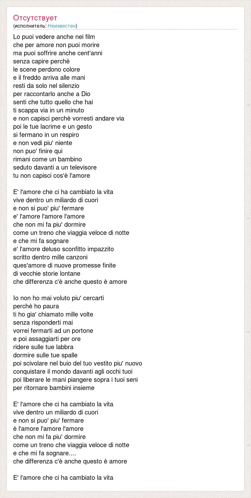 Lo puoi vedere anche nei film che per amore non puoi morire ma puoi soffrire anche cent'anni senza capire perchè le scene perdono colore e il freddo arriva alle mani resti da solo nel silenzio per raccontarlo anche a Dio senti che tutto quello che hai ti scappa via in un minuto e non capisci perchè vorresti andare via poi le tue lacrime e un gesto si fermano in un respiro e non vedi piu' niente non puo' finire qui rimani come un bambino seduto davanti a un televisore tu non capisci cos'è l'amore E' l'amore che ci ha cambiato la vita vive dentro un miliardo di cuori e non si puo' piu' fermare e' l'amore l'amore l'amore che non mi fa piu' dormire come un treno che viaggia veloce di notte e che mi fa sognare e' l'amore deluso sconfitto impazzito scritto dentro mille canzoni ques'amore di nuove promesse finite di vecchie storie lontane che differenza c'è anche questo è amore Io non ho mai voluto piu' cercarti perchè ho paura ti ho gia' chiamato mille volte senza risponderti mai vorrei fermarti ad un portone e poi assaggiarti per ore ridere sulle tue labbra dormire sulle tue spalle poi scivolare nel buio del tuo vestito piu' nuovo conquistare il mondo davanti agli occhi tuoi poi liberare le mani piangere sopra i tuoi seni per ritornare bambini insieme E' l'amore che ci ha cambiato la vita vive dentro un miliardo di cuori e non si puo' piu' fermare è l'amore l'amore l'amore che non mi fa piu' dormire come un treno che viaggia veloce di notte e che mi fa sognare.... che differenza c'è anche questo è amore E' l'amore che ci ha cambiato la vita