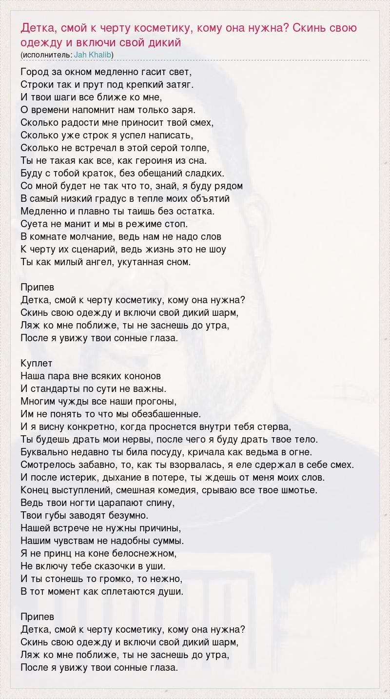 Город за окном медленно гасит свет, Строки так и прут под крепкий затяг. И твои шаги все ближе ко мне, О времени напомнит нам только заря. Сколько радости мне приносит твой смех, Сколько уже строк я успел написать, Сколько не встречал в этой серой толпе, Ты не такая как все, как героиня из сна. Буду с тобой краток, без обещаний сладких. Со мной будет не так что то, знай, я буду рядом В самый низкий градус в тепле моих объятий Медленно и плавно ты таишь без остатка. Суета не манит и мы в режиме стоп. В комнате молчание, ведь нам не надо слов К черту их сценарий, ведь жизнь это не шоу Ты как милый ангел, укутанная сном. Припев Детка, смой к черту косметику, кому она нужна? Скинь свою одежду и включи свой дикий шарм, Ляж ко мне поближе, ты не заснешь до утра, После я увижу твои сонные глаза. Куплет Наша пара вне всяких кононов И стандарты по сути не важны. Многим чужды все наши прогоны, Им не понять то что мы обезбашенные. И я висну конкретно, когда проснется внутри тебя стерва, Ты будешь драть мои нервы, после чего я буду драть твое тело. Буквально недавно ты била посуду, кричала как ведьма в огне. Смотрелось забавно, то, как ты взорвалась, я еле сдержал в себе смех. И после истерик, дыхание в потере, ты ждешь от меня моих слов. Конец выступлений, смешная комедия, срываю все твое шмотье. Ведь твои ногти царапают спину, Твои губы заводят безумно. Нашей встрече не нужны причины, Нашим чувствам не надобны суммы. Я не принц на коне белоснежном, Не включу тебе сказочки в уши. И ты стонешь то громко, то нежно, В тот момент как сплетаются души. Припев Детка, смой к черту косметику, кому она нужна? Скинь свою одежду и включи свой дикий шарм, Ляж ко мне поближе, ты не заснешь до утра, После я увижу твои сонные глаза.