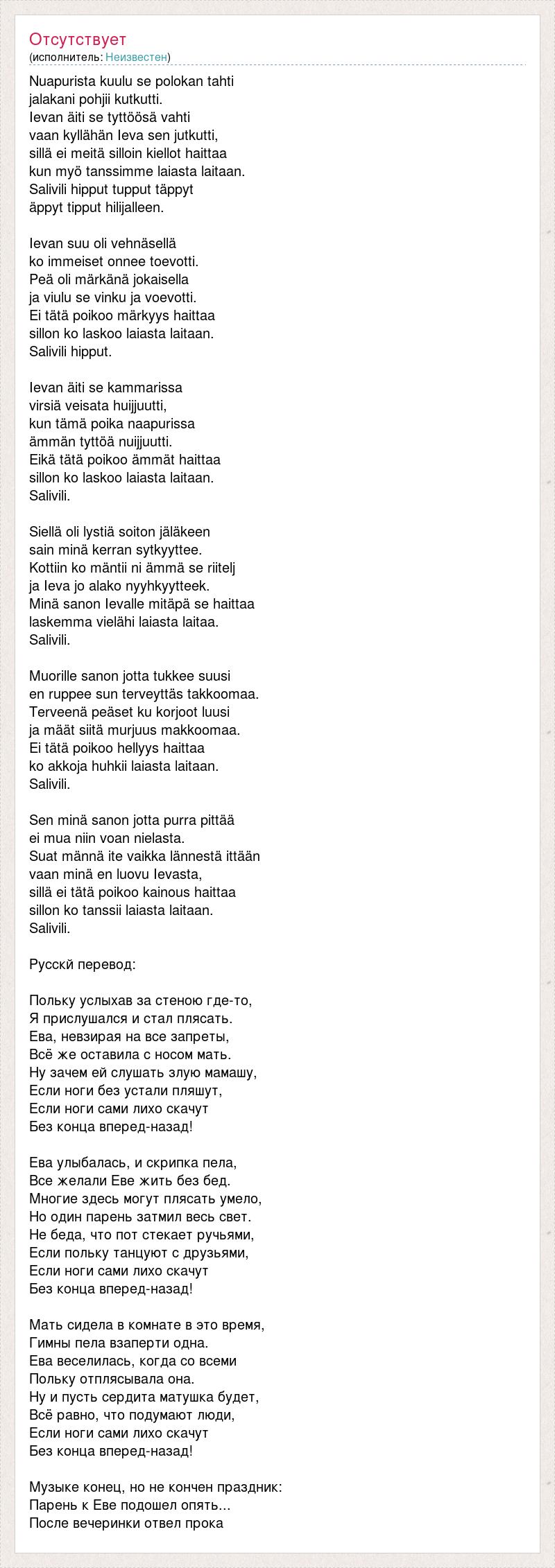 Nuapurista kuulu se polokan tahti jalakani pohjii kutkutti. Ievan äiti se tyttöösä vahti vaan kyllähän Ieva sen jutkutti, sillä ei meitä silloin kiellot haittaa kun myö tanssimme laiasta laitaan. Salivili hipput tupput täppyt äppyt tipput hilijalleen. Ievan suu oli vehnäsellä ko immeiset onnee toevotti. Peä oli märkänä jokaisella ja viulu se vinku ja voevotti. Ei tätä poikoo märkyys haittaa sillon ko laskoo laiasta laitaan. Salivili hipput. Ievan äiti se kammarissa virsiä veisata huijjuutti, kun tämä poika naapurissa ämmän tyttöä nuijjuutti. Eikä tätä poikoo ämmät haittaa sillon ko laskoo laiasta laitaan. Salivili. Siellä oli lystiä soiton jäläkeen sain minä kerran sytkyyttee. Kottiin ko mäntii ni ämmä se riitelj ja Ieva jo alako nyyhkyytteek. Minä sanon Ievalle mitäpä se haittaa laskemma vielähi laiasta laitaa. Salivili. Muorille sanon jotta tukkee suusi en ruppee sun terveyttäs takkoomaa. Terveenä peäset ku korjoot luusi ja määt siitä murjuus makkoomaa. Ei tätä poikoo hellyys haittaa ko akkoja huhkii laiasta laitaan. Salivili. Sen minä sanon jotta purra pittää ei mua niin voan nielasta. Suat männä ite vaikka lännestä ittään vaan minä en luovu Ievasta, sillä ei tätä poikoo kainous haittaa sillon ko tanssii laiasta laitaan. Salivili. Русскй перевод: Польку услыхав за стеною где-то, Я прислушался и стал плясать. Ева, невзирая на все запреты, Всё же оставила с носом мать. Ну зачем ей слушать злую мамашу, Если ноги без устали пляшут, Если ноги сами лихо скачут Без конца вперед-назад! Ева улыбалась, и скрипка пела, Все желали Еве жить без бед. Многие здесь могут плясать умело, Но один парень затмил весь свет. Не беда, что пот стекает ручьями, Если польку танцуют с друзьями, Если ноги сами лихо скачут Без конца вперед-назад! Мать сидела в комнате в это время, Гимны пела взаперти одна. Ева веселилась, когда со всеми Польку отплясывала она. Ну и пусть сердита матушка будет, Всё равно, что подумают люди, Если ноги сами лихо скачут Без конца вперед-назад! Музыке конец, но не кончен праздник: Парень к Еве подошел опять... После вечеринки отвел прока