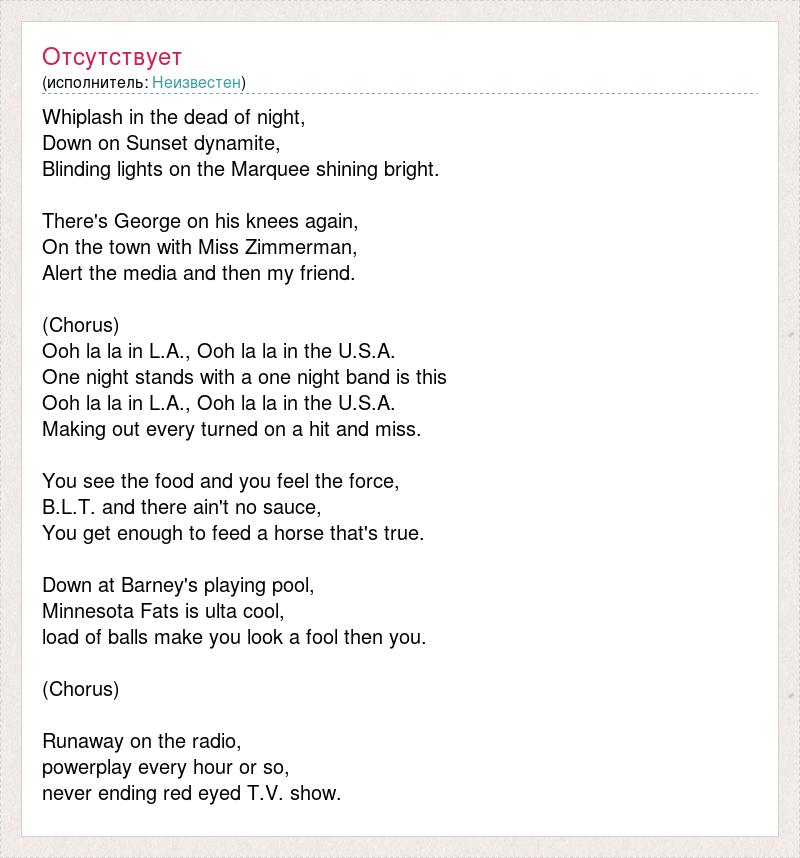 Whiplash in the dead of night, Down on Sunset dynamite, Blinding lights on the Marquee shining bright. There's George on his knees again, On the town with Miss Zimmerman, Alert the media and then my friend. (Chorus) Ooh la la in L.A., Ooh la la in the U.S.A. One night stands with a one night band is this Ooh la la in L.A., Ooh la la in the U.S.A. Making out every turned on a hit and miss. You see the food and you feel the force, B.L.T. and there ain't no sauce, You get enough to feed a horse that's true. Down at Barney's playing pool, Minnesota Fats is ulta cool, load of balls make you look a fool then you. (Chorus) Runaway on the radio, powerplay every hour or so, never ending red eyed T.V. show.