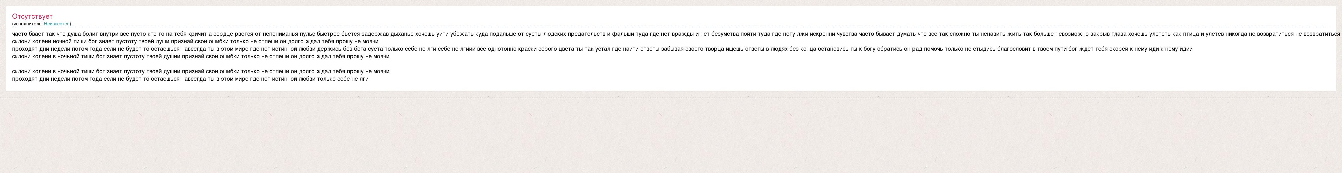 часто бвает так что душа болит внутри все пусто кто то на тебя кричит а сердце рвется от непониманья пульс быстрее бьется задержав дыханье хочешь уйти убежать куда подальше от суеты людских предательств и фальши туда где нет вражды и нет безумства пойти туда где нету лжи искренни чувства часто бывает думать что все так сложно ты ненавить жить так больше невозможно закрыв глаза хочешь улететь как птица и улетев никогда не возвратиться не возвратиться склони колени ночной тиши бог знает пустоту твоей души признай свои ошибки только не сппеши он долго ждал тебя прошу не молчи проходят дни недели потом года если не будет то остаешься навсегда ты в этом мире где нет истинной любви держись без бога суета только себе не лги себе не лгиии все однотонно краски серого цвета ты так устал где найти ответы забывая своего творца ищешь ответы в людях без конца остановись ты к богу обратись он рад помочь только не стыдись благословит в твоем пути бог ждет тебя скорей к нему иди к нему идии склони колени в ночьной тиши бог знает пустоту твоей душии признай свои ошибки только не сппеши он долго ждал тебя прошу не молчи склони колени в ночьной тиши бог знает пустоту твоей душии признай свои ошибки только не сппеши он долго ждал тебя прошу не молчи проходят дни недели потом года если не будет то остаешься навсегда ты в этом мире где нет истинной любви только себе не лги