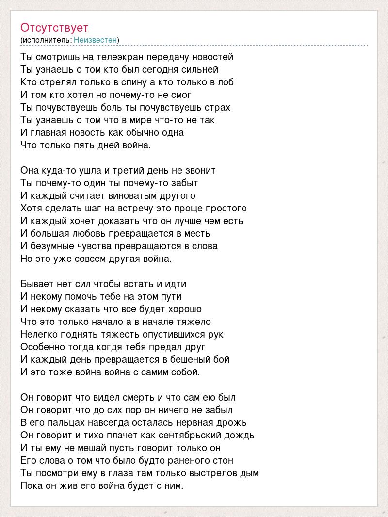 Ты смотришь на телеэкран передачу новостей Ты узнаешь о том кто был сегодня сильней Кто стрелял только в спину а кто только в лоб И том кто хотел но почему-то не смог Ты почувствуешь боль ты почувствуешь страх Ты узнаешь о том что в мире что-то не так И главная новость как обычно одна Что только пять дней война. Она куда-то ушла и третий день не звонит Ты почему-то один ты почему-то забыт И каждый считает виноватым другого Хотя сделать шаг на встречу это проще простого И каждый хочет доказать что он лучше чем есть И большая любовь превращается в месть И безумные чувства превращаются в слова Но это уже совсем другая война. Бывает нет сил чтобы встать и идти И некому помочь тебе на этом пути И некому сказать что все будет хорошо Что это только начало а в начале тяжело Нелегко поднять тяжесть опустившихся рук Особенно тогда когдя тебя предал друг И каждый день превращается в бешеный бой И это тоже война война с самим собой. Он говорит что видел смерть и что сам ею был Он говорит что до сих пор он ничего не забыл В его пальцах навсегда осталась нервная дрожь Он говорит и тихо плачет как сентябрьский дождь И ты ему не мешай пусть говорит только он Его слова о том что было будто раненого стон Ты посмотри ему в глаза там только выстрелов дым Пока он жив его война будет с ним.