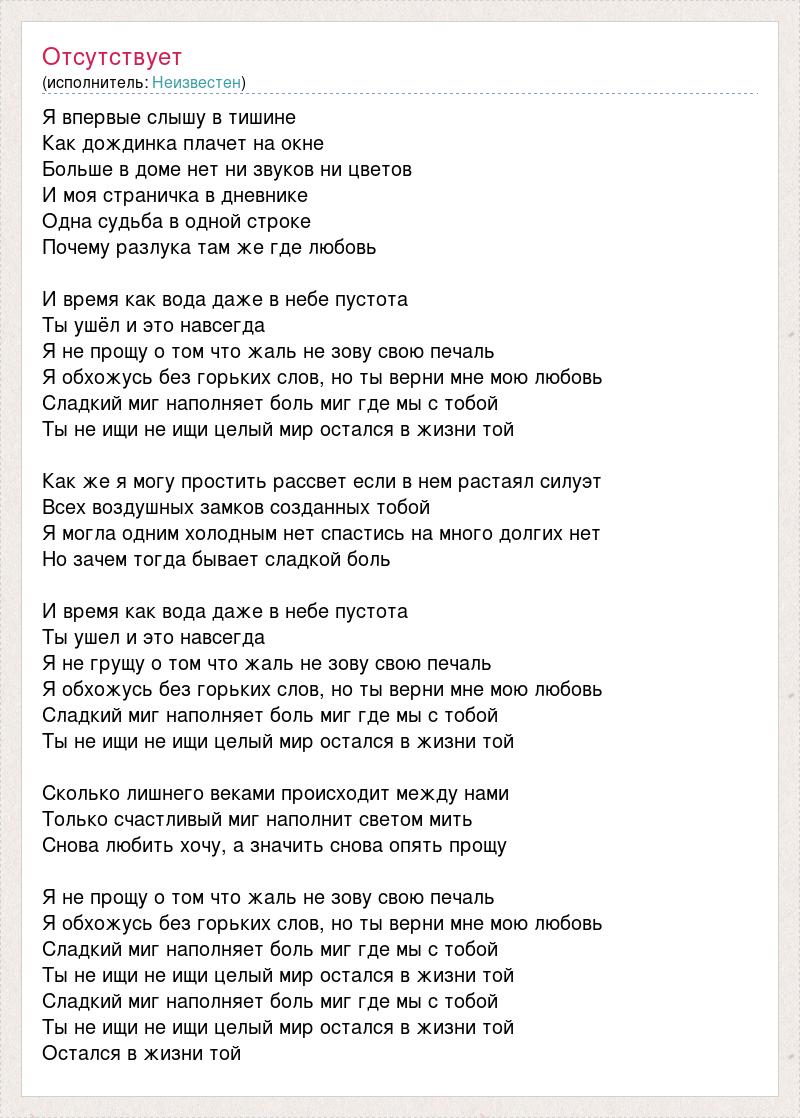 Я впервые слышу в тишине Как дождинка плачет на окне Больше в доме нет ни звуков ни цветов И моя страничка в дневнике Одна судьба в одной строке Почему разлука там же где любовь И время как вода даже в небе пустота Ты ушёл и это навсегда Я не прощу о том что жаль не зову свою печаль Я обхожусь без горьких слов, но ты верни мне мою любовь Сладкий миг наполняет боль миг где мы с тобой Ты не ищи не ищи целый мир остался в жизни той Как же я могу простить рассвет если в нем растаял силуэт Всех воздушных замков созданных тобой Я могла одним холодным нет спастись на много долгих нет Но зачем тогда бывает сладкой боль И время как вода даже в небе пустота Ты ушел и это навсегда Я не грущу о том что жаль не зову свою печаль Я обхожусь без горьких слов, но ты верни мне мою любовь Сладкий миг наполняет боль миг где мы с тобой Ты не ищи не ищи целый мир остался в жизни той Сколько лишнего веками происходит между нами Только счастливый миг наполнит светом мить Снова любить хочу, а значить снова опять прощу Я не прощу о том что жаль не зову свою печаль Я обхожусь без горьких слов, но ты верни мне мою любовь Сладкий миг наполняет боль миг где мы с тобой Ты не ищи не ищи целый мир остался в жизни той Сладкий миг наполняет боль миг где мы с тобой Ты не ищи не ищи целый мир остался в жизни той Остался в жизни той