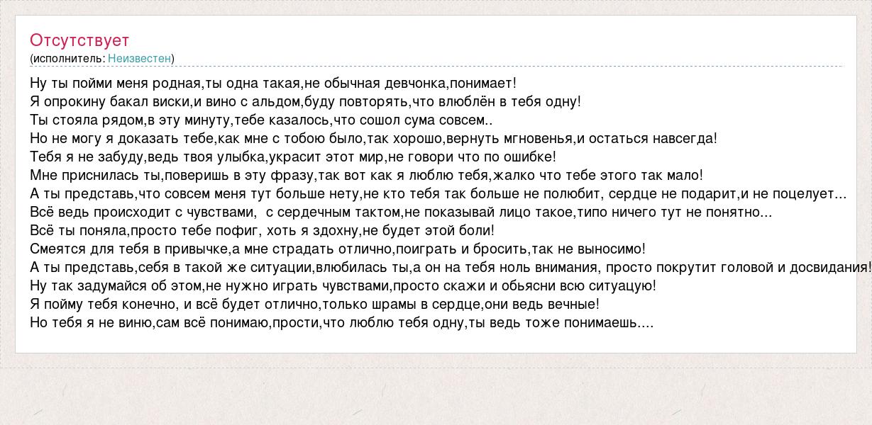 Ну ты пойми меня родная,ты одна такая,не обычная девчонка,понимает! Я опрокину бакал виски,и вино с альдом,буду повторять,что влюблён в тебя одну! Ты стояла рядом,в эту минуту,тебе казалось,что сошол сума совсем.. Но не могу я доказать тебе,как мне с тобою было,так хорошо,вернуть мгновенья,и остаться навсегда! Тебя я не забуду,ведь твоя улыбка,украсит этот мир,не говори что по ошибке! Мне приснилась ты,поверишь в эту фразу,так вот как я люблю тебя,жалко что тебе этого так мало! А ты представь,что совсем меня тут больше нету,не кто тебя так больше не полюбит, сердце не подарит,и не поцелует... Всё ведь происходит с чувствами, с сердечным тактом,не показывай лицо такое,типо ничего тут не понятно... Всё ты поняла,просто тебе пофиг, хоть я здохну,не будет этой боли! Смеятся для тебя в привычке,а мне страдать отлично,поиграть и бросить,так не выносимо! А ты представь,себя в такой же ситуации,влюбилась ты,а он на тебя ноль внимания, просто покрутит головой и досвидания! Ну так задумайся об этом,не нужно играть чувствами,просто скажи и обьясни всю ситуацую! Я пойму тебя конечно, и всё будет отлично,только шрамы в сердце,они ведь вечные! Но тебя я не виню,сам всё понимаю,прости,что люблю тебя одну,ты ведь тоже понимаешь....