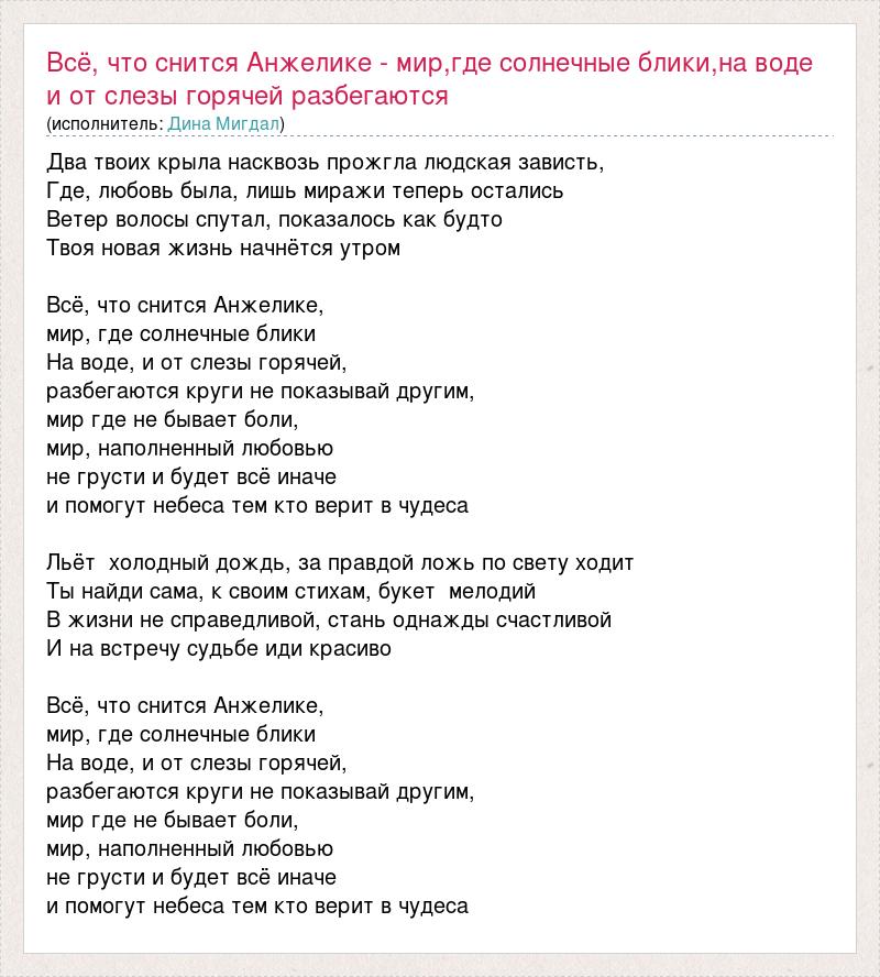 Два твоих крыла насквозь прожгла людская зависть, Где, любовь была, лишь миражи теперь остались Ветер волосы спутал, показалось как будто Твоя новая жизнь начнётся утром Всё, что снится Анжелике, мир, где солнечные блики На воде, и от слезы горячей, разбегаются круги не показывай другим, мир где не бывает боли, мир, наполненный любовью не грусти и будет всё иначе и помогут небеса тем кто верит в чудеса Льёт холодный дождь, за правдой ложь по свету ходит Ты найди сама, к своим стихам, букет мелодий В жизни не справедливой, стань однажды счастливой И на встречу судьбе иди красиво Всё, что снится Анжелике, мир, где солнечные блики На воде, и от слезы горячей, разбегаются круги не показывай другим, мир где не бывает боли, мир, наполненный любовью не грусти и будет всё иначе и помогут небеса тем кто верит в чудеса