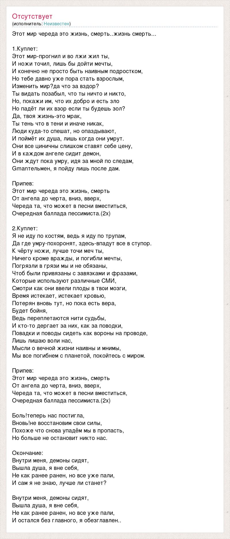 Этот мир череда это жизнь, смерть..жизнь смерть... 1.Куплет: Этот мир-прогнил и во лжи жил ты, И ножи точил, лишь бы дойти мечты, И конечно не просто быть наивным подростком, Но тебе давно уже пора стать взрослым, Изменить мир?да что за вздор? Ты видать позабыл, что ты ничто и никто, Но, покажи им, что их добро и есть зло Но падёт ли их взор если ты будешь зол? Да, твоя жизнь-это мрак, Ты тень что в тени и иначе никак, Люди куда-то спешат, но опаздывают, И поймёт их душа, лишь когда они умрут. Они все циничны слишком ставят себе цену, И в каждом ангеле сидит демон, Они ждут пока умру, идя за мной по следам, Gmanтельмен, я пойду лишь после дам. Припев: Этот мир череда это жизнь, смерть От ангела до черта, вниз, вверх, Череда та, что может в песни вместиться, Очередная баллада пессимиста.(2х) 2.Куплет: Я не иду по костям, ведь я иду по трупам, Да где умру-похоронят, здесь-впадут все в ступор. К чёрту ножи, лучше точи меч ты, Ничего кроме вражды, и погибли мечты, Погрязли в грязи мы и не обязаны, Чтоб были привязаны с завязками и фразами, Которые используют различные СМИ, Смотри как они ввели плоды в твои мозги, Время истекает, истекает кровью, Потерян вновь тут, но пока есть вера, Будет бойня, Ведь переплетаются нити судьбы, И кто-то дергает за них, как за поводки, Повадки и поводы сидеть как вороны на проводе, Лишь лишаю воли нас, Мысли о вечной жизни наивны и мнимы, Мы все погибнем с планетой, покойтесь с миром. Припев: Этот мир череда это жизнь, смерть От ангела до черта, вниз, вверх, Череда та, что может в песни вместиться, Очередная баллада пессимиста.(2х) Боль!теперь нас постигла, Вновь!не восстановим свои силы, Похоже что снова упадём мы в пропасть, Но больше не остановит никто нас. Окончание: Внутри меня, демоны сидят, Вышла душа, я вне себя, Не как ранее ранен, но все уже пали, И сам я не знаю, лучше ли станет? Внутри меня, демоны сидят, Вышла душа, я вне себя, Не как ранее ранен, но все уже пали, И остался без главного, я обезглавлен..