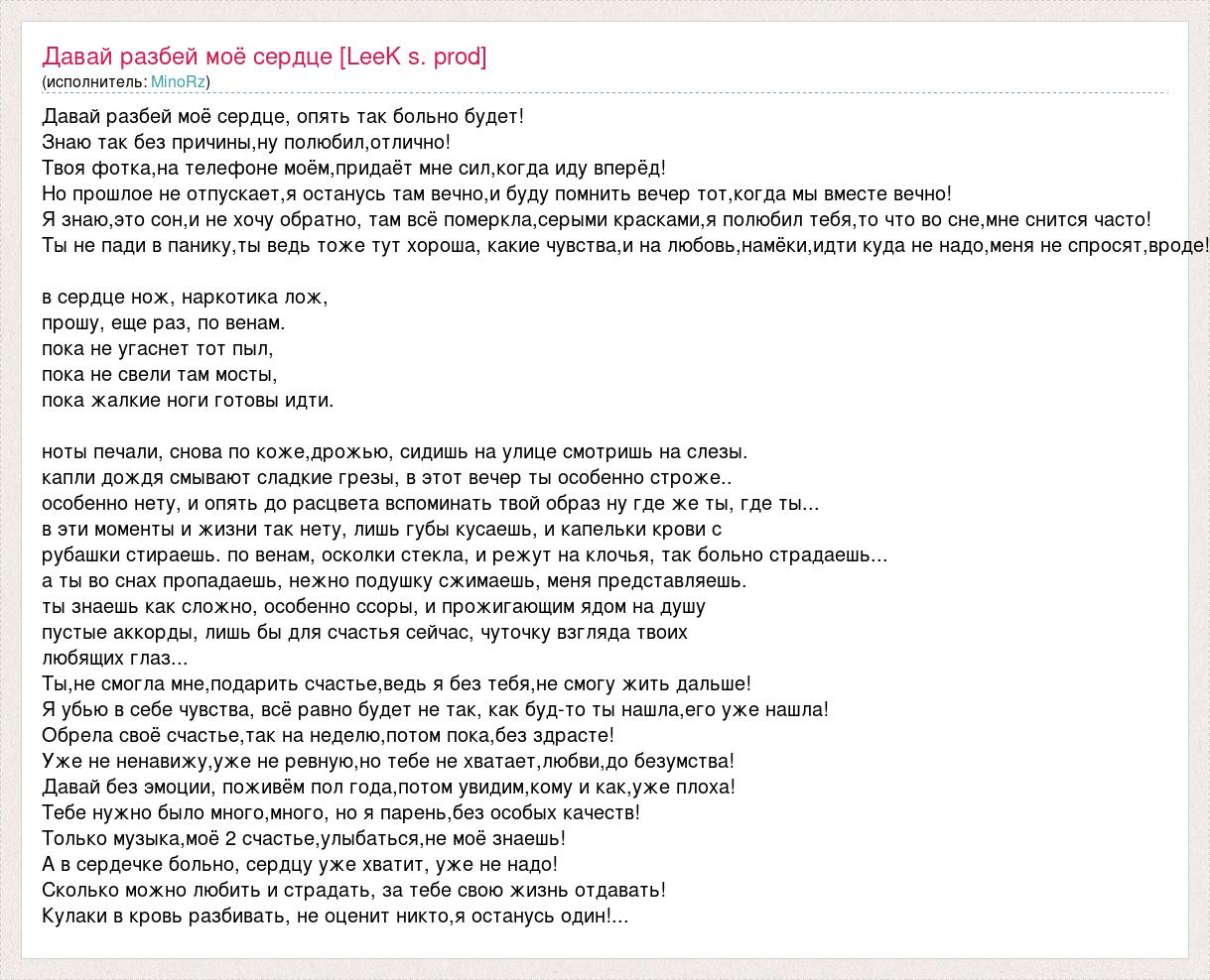 Давай разбей моё сердце, опять так больно будет! Знаю так без причины,ну полюбил,отлично! Твоя фотка,на телефоне моём,придаёт мне сил,когда иду вперёд! Но прошлое не отпускает,я останусь там вечно,и буду помнить вечер тот,когда мы вместе вечно! Я знаю,это сон,и не хочу обратно, там всё померкла,серыми красками,я полюбил тебя,то что во сне,мне снится часто! Ты не пади в панику,ты ведь тоже тут хороша, какие чувства,и на любовь,намёки,идти куда не надо,меня не спросят,вроде! в сердце нож, наркотика лож, прошу, еще раз, по венам. пока не угаснет тот пыл, пока не свели там мосты, пока жалкие ноги готовы идти. ноты печали, снова по коже,дрожью, сидишь на улице смотришь на слезы. капли дождя смывают сладкие грезы, в этот вечер ты особенно строже.. особенно нету, и опять до расцвета вспоминать твой образ ну где же ты, где ты... в эти моменты и жизни так нету, лишь губы кусаешь, и капельки крови с рубашки стираешь. по венам, осколки стекла, и режут на клочья, так больно страдаешь... а ты во снах пропадаешь, нежно подушку сжимаешь, меня представляешь. ты знаешь как сложно, особенно ссоры, и прожигающим ядом на душу пустые аккорды, лишь бы для счастья сейчас, чуточку взгляда твоих любящих глаз... Ты,не смогла мне,подарить счастье,ведь я без тебя,не смогу жить дальше! Я убью в себе чувства, всё равно будет не так, как буд-то ты нашла,его уже нашла! Обрела своё счастье,так на неделю,потом пока,без здрасте! Уже не ненавижу,уже не ревную,но тебе не хватает,любви,до безумства! Давай без эмоции, поживём пол года,потом увидим,кому и как,уже плоха! Тебе нужно было много,много, но я парень,без особых качеств! Только музыка,моё 2 счастье,улыбаться,не моё знаешь! А в сердечке больно, сердцу уже хватит, уже не надо! Сколько можно любить и страдать, за тебе свою жизнь отдавать! Кулаки в кровь разбивать, не оценит никто,я останусь один!...