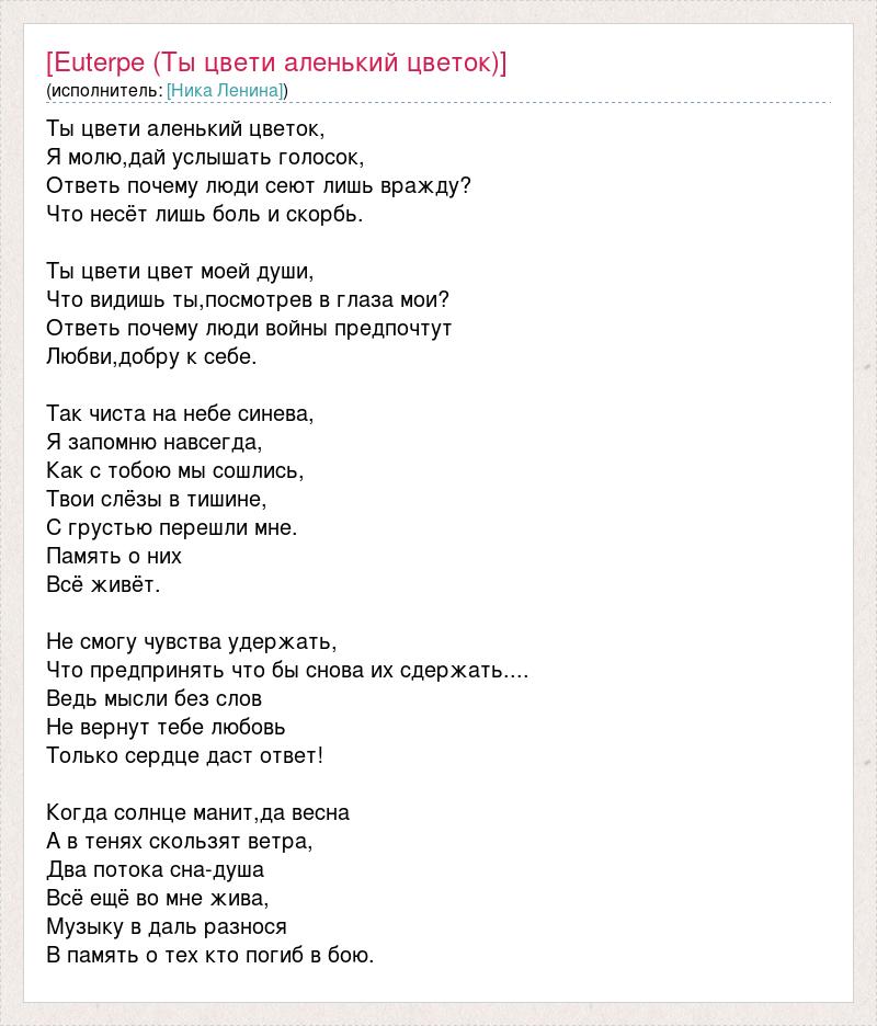 Ты цвети аленький цветок, Я молю,дай услышать голосок, Ответь почему люди сеют лишь вражду? Что несёт лишь боль и скорбь. Ты цвети цвет моей души, Что видишь ты,посмотрев в глаза мои? Ответь почему люди войны предпочтут Любви,добру к себе. Так чиста на небе синева, Я запомню навсегда, Как с тобою мы сошлись, Твои слёзы в тишине, С грустью перешли мне. Память о них Всё живёт. Не смогу чувства удержать, Что предпринять что бы снова их сдержать.... Ведь мысли без слов Не вернут тебе любовь Только сердце даст ответ! Когда солнце манит,да весна А в тенях скользят ветра, Два потока сна-душа Всё ещё во мне жива, Музыку в даль разнося В память о тех кто погиб в бою.