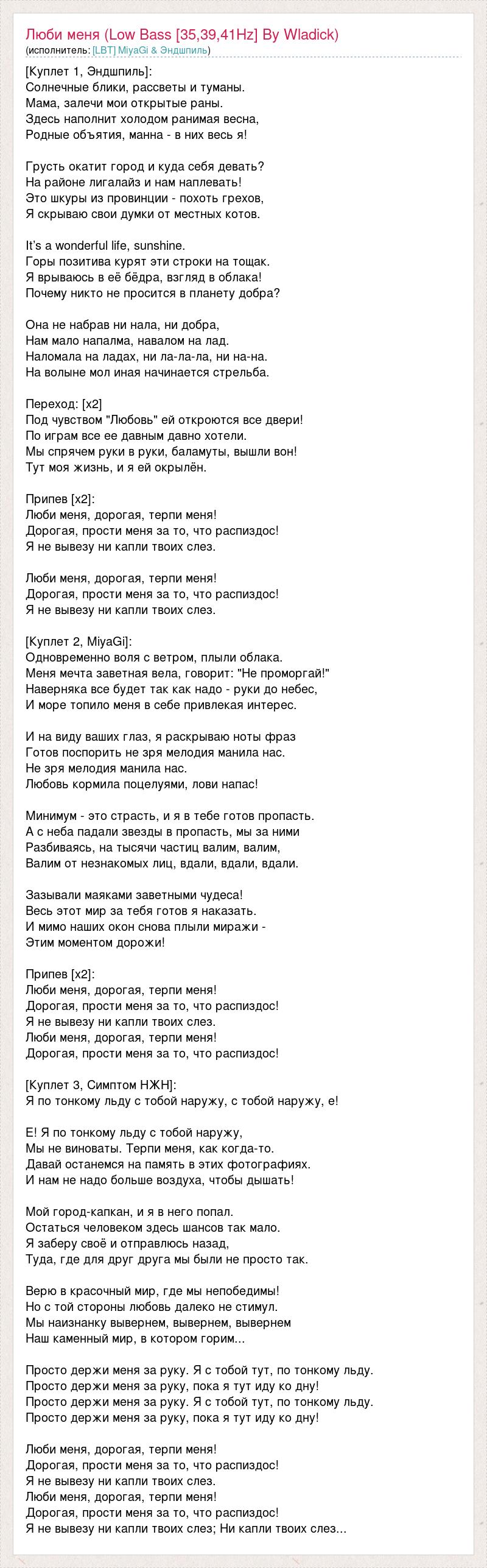 [Куплет 1, Эндшпиль]: Солнечные блики, рассветы и туманы. Мама, залечи мои открытые раны. Здесь наполнит холодом ранимая весна, Родные объятия, манна - в них весь я! Грусть окатит город и куда себя девать? На районе лигалайз и нам наплевать! Это шкуры из провинции - похоть грехов, Я скрываю свои думки от местных котов. It’s a wonderful life, sunshine. Горы позитива курят эти строки на тощак. Я врываюсь в её бёдра, взгляд в облака! Почему никто не просится в планету добра? Она не набрав ни нала, ни добра, Нам мало напалма, навалом на лад. Наломала на ладах, ни ла-ла-ла, ни на-на. На волыне мол иная начинается стрельба. Переход: [х2] Под чувством "Любовь" ей откроются все двери! По играм все ее давным давно хотели. Мы спрячем руки в руки, баламуты, вышли вон! Тут моя жизнь, и я ей окрылён. Припев [х2]: Люби меня, дорогая, терпи меня! Дорогая, прости меня за то, что распиздос! Я не вывезу ни капли твоих слез. Люби меня, дорогая, терпи меня! Дорогая, прости меня за то, что распиздос! Я не вывезу ни капли твоих слез. [Куплет 2, MiyaGi]: Одновременно воля с ветром, плыли облака. Меня мечта заветная вела, говорит: "Не проморгай!" Наверняка все будет так как надо - руки до небес, И море топило меня в себе привлекая интерес. И на виду ваших глаз, я раскрываю ноты фраз Готов поспорить не зря мелодия манила нас. Не зря мелодия манила нас. Любовь кормила поцелуями, лови напас! Минимум - это страсть, и я в тебе готов пропасть. А с неба падали звезды в пропасть, мы за ними Разбиваясь, на тысячи частиц валим, валим, Валим от незнакомых лиц, вдали, вдали, вдали. Зазывали маяками заветными чудеса! Весь этот мир за тебя готов я наказать. И мимо наших окон снова плыли миражи - Этим моментом дорожи! Припев [х2]: Люби меня, дорогая, терпи меня! Дорогая, прости меня за то, что распиздос! Я не вывезу ни капли твоих слез. Люби меня, дорогая, терпи меня! Дорогая, прости меня за то, что распиздос! [Куплет 3, Симптом НЖН]: Я по тонкому льду с тобой наружу, с тобой наружу, е! Е! Я по тонкому льду с тобой наружу, Мы не виноваты. Терпи меня, как когда-то. Давай останемся на память в этих фотографиях. И нам не надо больше воздуха, чтобы дышать! Мой город-капкан, и я в него попал. Остаться человеком здесь шансов так мало. Я заберу своё и отправлюсь назад, Туда, где для друг друга мы были не просто так. Верю в красочный мир, где мы непобедимы! Но с той стороны любовь далеко не стимул. Мы наизнанку вывернем, вывернем, вывернем Наш каменный мир, в котором горим... Просто держи меня за руку. Я с тобой тут, по тонкому льду. Просто держи меня за руку, пока я тут иду ко дну! Просто держи меня за руку. Я с тобой тут, по тонкому льду. Просто держи меня за руку, пока я тут иду ко дну! Люби меня, дорогая, терпи меня! Дорогая, прости меня за то, что распиздос! Я не вывезу ни капли твоих слез. Люби меня, дорогая, терпи меня! Дорогая, прости меня за то, что распиздос! Я не вывезу ни капли твоих слез; Ни капли твоих слез...