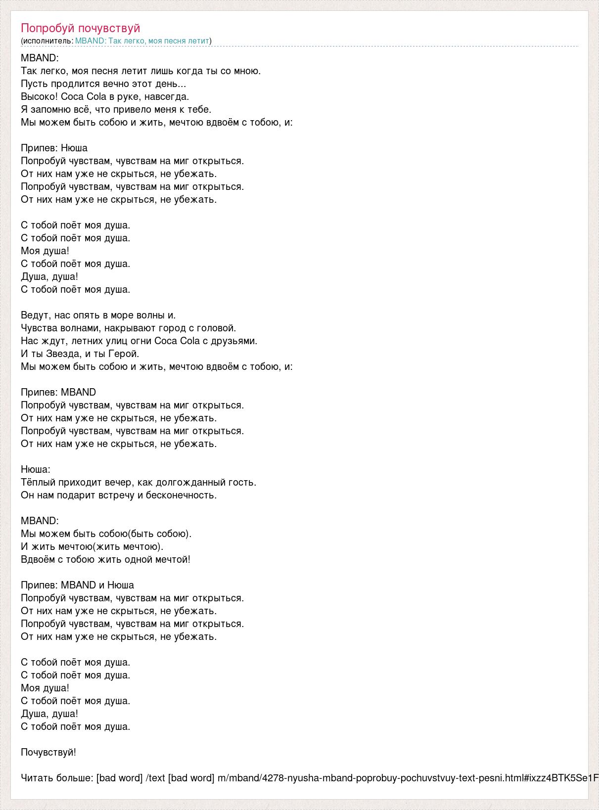 MBAND: Так легко, моя песня летит лишь когда ты со мною. Пусть продлится вечно этот день... Высоко! Coca Cola в руке, навсегда. Я запомню всё, что привело меня к тебе. Мы можем быть собою и жить, мечтою вдвоём с тобою, и: Припев: Нюша Попробуй чувствам, чувствам на миг открыться. От них нам уже не скрыться, не убежать. Попробуй чувствам, чувствам на миг открыться. От них нам уже не скрыться, не убежать. С тобой поёт моя душа. С тобой поёт моя душа. Моя душа! С тобой поёт моя душа. Душа, душа! С тобой поёт моя душа. Ведут, нас опять в море волны и. Чувства волнами, накрывают город с головой. Нас ждут, летних улиц огни Coca Cola с друзьями. И ты Звезда, и ты Герой. Мы можем быть собою и жить, мечтою вдвоём с тобою, и: Припев: MBAND Попробуй чувствам, чувствам на миг открыться. От них нам уже не скрыться, не убежать. Попробуй чувствам, чувствам на миг открыться. От них нам уже не скрыться, не убежать. Нюша: Тёплый приходит вечер, как долгожданный гость. Он нам подарит встречу и бесконечность. MBAND: Мы можем быть собою(быть собою). И жить мечтою(жить мечтою). Вдвоём с тобою жить одной мечтой! Припев: MBAND и Нюша Попробуй чувствам, чувствам на миг открыться. От них нам уже не скрыться, не убежать. Попробуй чувствам, чувствам на миг открыться. От них нам уже не скрыться, не убежать. С тобой поёт моя душа. С тобой поёт моя душа. Моя душа! С тобой поёт моя душа. Душа, душа! С тобой поёт моя душа. Почувствуй! Читать больше: [bad word] /text [bad word] m/mband/4278-nyusha-mband-poprobuy-pochuvstvuy-text-pesni.html#ixzz4BTK5Se1F