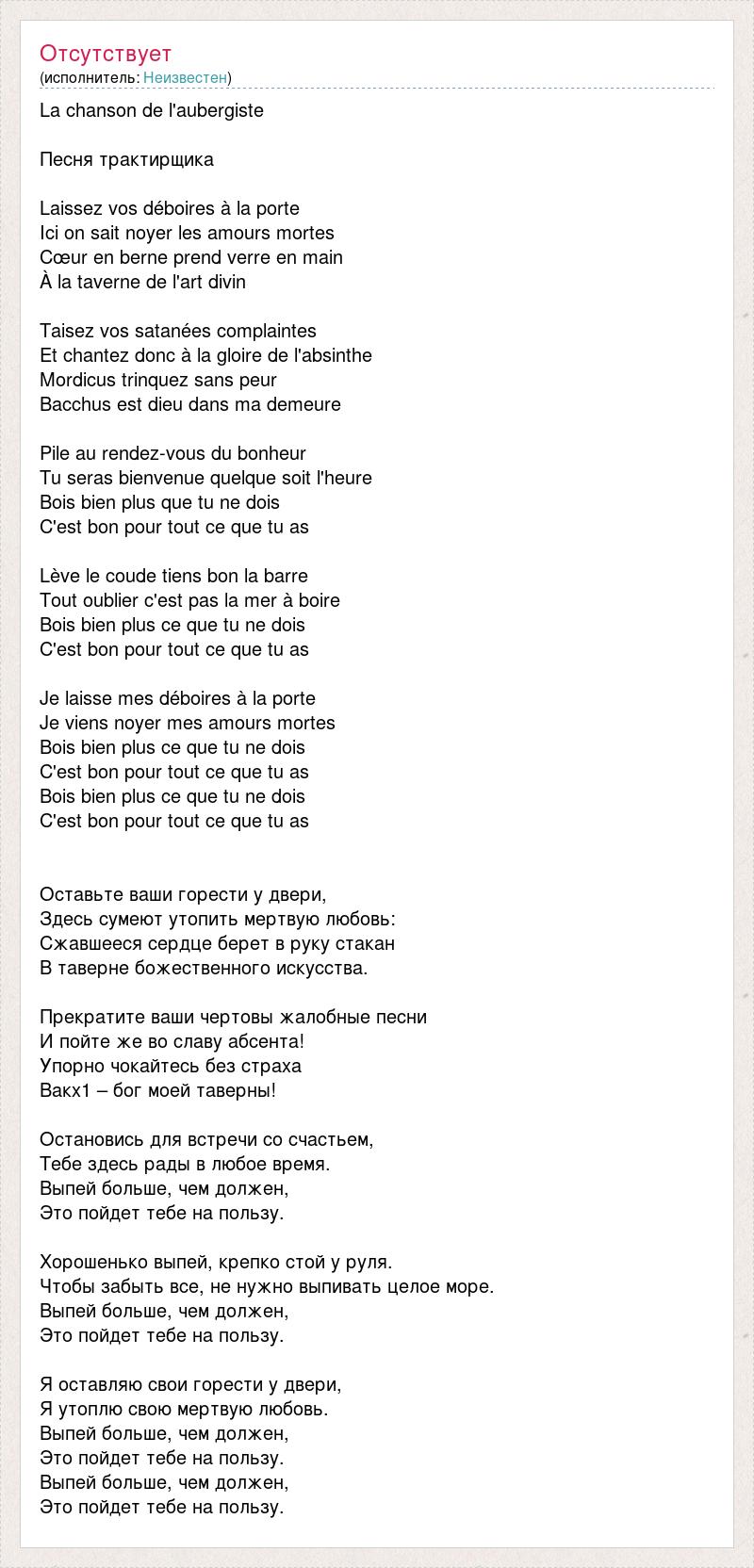 La chanson de l'aubergiste Песня трактирщика Laissez vos déboires à la porte Ici on sait noyer les amours mortes Cœur en berne prend verre en main À la taverne de l'art divin Taisez vos satanées complaintes Et chantez donc à la gloire de l'absinthe Mordicus trinquez sans peur Bacchus est dieu dans ma demeure Pile au rendez-vous du bonheur Tu seras bienvenue quelque soit l'heure Bois bien plus que tu ne dois C'est bon pour tout ce que tu as Lève le coude tiens bon la barre Tout oublier c'est pas la mer à boire Bois bien plus ce que tu ne dois C'est bon pour tout ce que tu as Je laisse mes déboires à la porte Je viens noyer mes amours mortes Bois bien plus ce que tu ne dois C'est bon pour tout ce que tu as Bois bien plus ce que tu ne dois C'est bon pour tout ce que tu as Оставьте ваши горести у двери, Здесь сумеют утопить мертвую любовь: Сжавшееся сердце берет в руку стакан В таверне божественного искусства. Прекратите ваши чертовы жалобные песни И пойте же во славу абсента! Упорно чокайтесь без страха Вакх1 – бог моей таверны! Остановись для встречи со счастьем, Тебе здесь рады в любое время. Выпей больше, чем должен, Это пойдет тебе на пользу. Хорошенько выпей, крепко стой у руля. Чтобы забыть все, не нужно выпивать целое море. Выпей больше, чем должен, Это пойдет тебе на пользу. Я оставляю свои горести у двери, Я утоплю свою мертвую любовь. Выпей больше, чем должен, Это пойдет тебе на пользу. Выпей больше, чем должен, Это пойдет тебе на пользу.