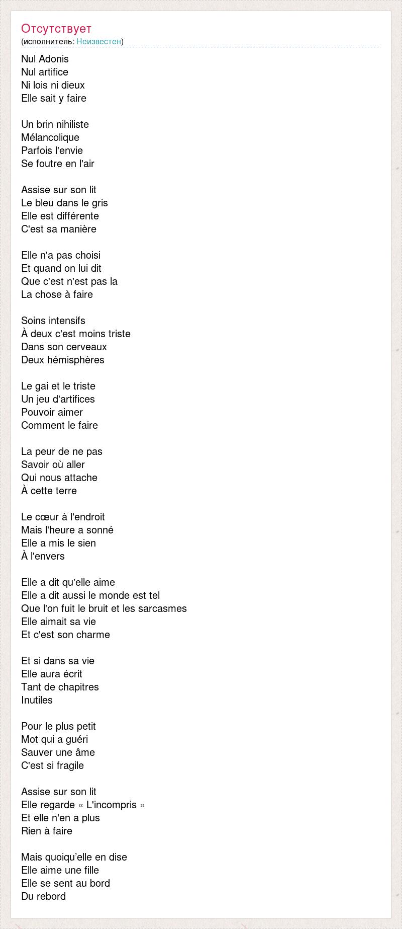 Nul Adonis Nul artifice Ni lois ni dieux Elle sait y faire Un brin nihiliste Mélancolique Parfois l'envie Se foutre en l'air Assise sur son lit Le bleu dans le gris Elle est différente C'est sa manière Elle n'a pas choisi Et quand on lui dit Que c'est n'est pas la La chose à faire Soins intensifs À deux c'est moins triste Dans son cerveaux Deux hémisphères Le gai et le triste Un jeu d'artifices Pouvoir aimer Comment le faire La peur de ne pas Savoir où aller Qui nous attache À cette terre Le cœur à l'endroit Mais l'heure a sonné Elle a mis le sien À l'envers Elle a dit qu'elle aime Elle a dit aussi le monde est tel Que l'on fuit le bruit et les sarcasmes Elle aimait sa vie Et c'est son charme Et si dans sa vie Elle aura écrit Tant de chapitres Inutiles Pour le plus petit Mot qui a guéri Sauver une âme C'est si fragile Assise sur son lit Elle regarde « L'incompris » Et elle n'en a plus Rien à faire Mais quoiqu’elle en dise Elle aime une fille Elle se sent au bord Du rebord