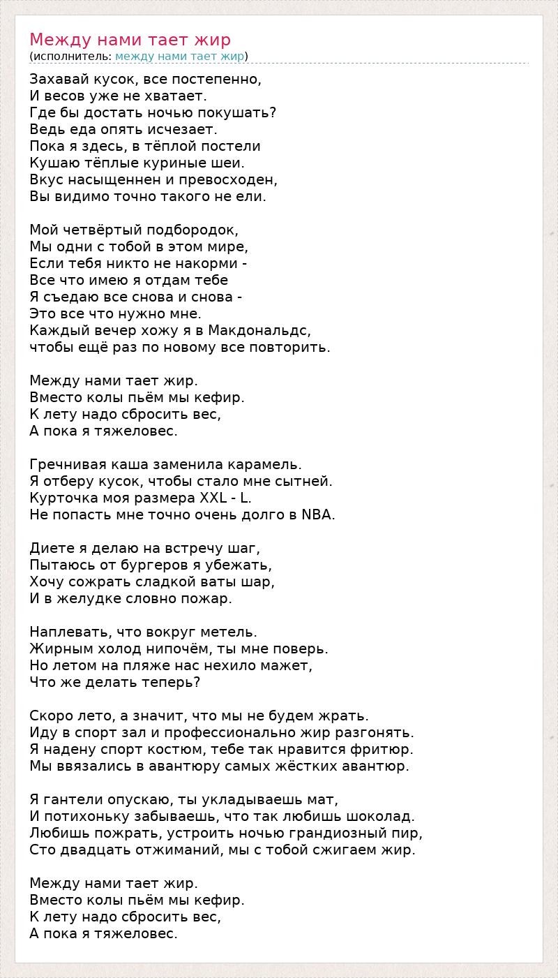 Захавай кусок, все постепенно, И весов уже не хватает. Где бы достать ночью покушать? Ведь еда опять исчезает. Пока я здесь, в тёплой постели Кушаю тёплые куриные шеи. Вкус насыщеннен и превосходен, Вы видимо точно такого не ели. Мой четвёртый подбородок, Мы одни с тобой в этом мире, Если тебя никто не накорми - Все что имею я отдам тебе Я съедаю все снова и снова - Это все что нужно мне. Каждый вечер хожу я в Макдональдс, чтобы ещё раз по новому все повторить. Между нами тает жир. Вместо колы пьём мы кефир. К лету надо сбросить вес, А пока я тяжеловес. Гречнивая каша заменила карамель. Я отберу кусок, чтобы стало мне сытней. Курточка моя размера ХХL - L. Не попасть мне точно очень долго в NBA. Диете я делаю на встречу шаг, Пытаюсь от бургеров я убежать, Хочу сожрать сладкой ваты шар, И в желудке словно пожар. Наплевать, что вокруг метель. Жирным холод нипочём, ты мне поверь. Но летом на пляже нас нехило мажет, Что же делать теперь? Скоро лето, а значит, что мы не будем жрать. Иду в спорт зал и профессионально жир разгонять. Я надену спорт костюм, тебе так нравится фритюр. Мы ввязались в авантюру самых жёстких авантюр. Я гантели опускаю, ты укладываешь мат, И потихоньку забываешь, что так любишь шоколад. Любишь пожрать, устроить ночью грандиозный пир, Сто двадцать отжиманий, мы с тобой сжигаем жир. Между нами тает жир. Вместо колы пьём мы кефир. К лету надо сбросить вес, А пока я тяжеловес.