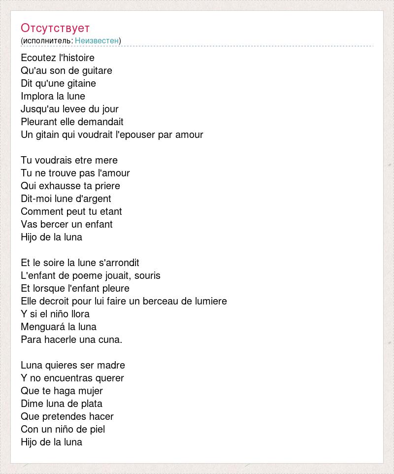 Ecoutez l'histoire Qu'au son de guitare Dit qu'une gitaine Implora la lune Jusqu'au levee du jour Pleurant elle demandait Un gitain qui voudrait l'epouser par amour Tu voudrais etre mere Tu ne trouve pas l'amour Qui exhausse ta priere Dit-moi lune d'argent Comment peut tu etant Vas bercer un enfant Hijo de la luna Et le soire la lune s'arrondit L'enfant de poeme jouait, souris Et lorsque l'enfant pleure Elle decroit pour lui faire un berceau de lumiere Y si el niño llora Menguará la luna Para hacerle una cuna. Luna quieres ser madre Y no encuentras querer Que te haga mujer Dime luna de plata Que pretendes hacer Con un niño de piel Hijo de la luna