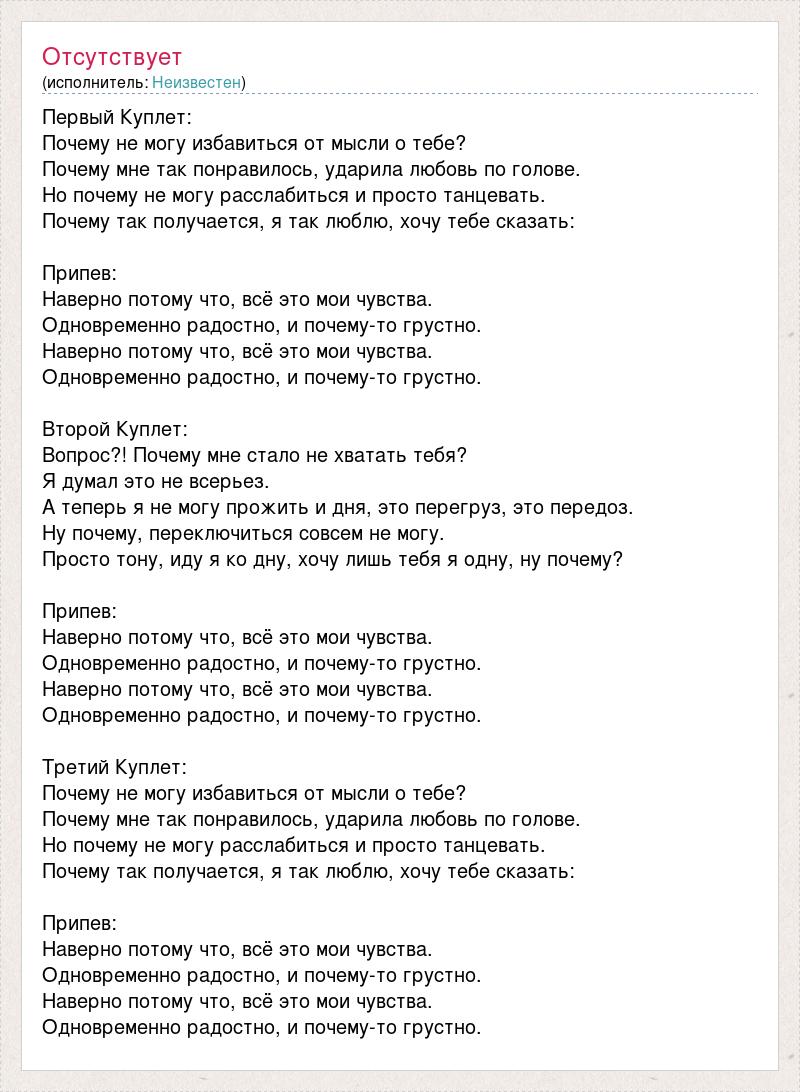 Первый Куплет: Почему не могу избавиться от мысли о тебе? Почему мне так понравилось, ударила любовь по голове. Но почему не могу расслабиться и просто танцевать. Почему так получается, я так люблю, хочу тебе сказать: Припев: Наверно потому что, всё это мои чувства. Одновременно радостно, и почему-то грустно. Наверно потому что, всё это мои чувства. Одновременно радостно, и почему-то грустно. Второй Куплет: Вопрос?! Почему мне стало не хватать тебя? Я думал это не всерьез. А теперь я не могу прожить и дня, это перегруз, это передоз. Ну почему, переключиться совсем не могу. Просто тону, иду я ко дну, хочу лишь тебя я одну, ну почему? Припев: Наверно потому что, всё это мои чувства. Одновременно радостно, и почему-то грустно. Наверно потому что, всё это мои чувства. Одновременно радостно, и почему-то грустно. Третий Куплет: Почему не могу избавиться от мысли о тебе? Почему мне так понравилось, ударила любовь по голове. Но почему не могу расслабиться и просто танцевать. Почему так получается, я так люблю, хочу тебе сказать: Припев: Наверно потому что, всё это мои чувства. Одновременно радостно, и почему-то грустно. Наверно потому что, всё это мои чувства. Одновременно радостно, и почему-то грустно.