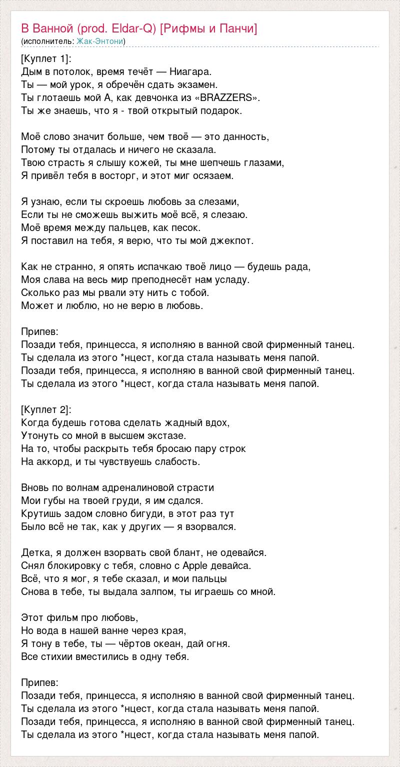 [Куплет 1]: Дым в потолок, время течёт — Ниагара. Ты — мой урок, я обречён сдать экзамен. Ты глотаешь мой А, как девчонка из «BRAZZERS». Ты же знаешь, что я - твой открытый подарок. Моё слово значит больше, чем твоё — это данность, Потому ты отдалась и ничего не сказала. Твою страсть я слышу кожей, ты мне шепчешь глазами, Я привёл тебя в восторг, и этот миг осязаем. Я узнаю, если ты скроешь любовь за слезами, Если ты не сможешь выжить моё всё, я слезаю. Моё время между пальцев, как песок. Я поставил на тебя, я верю, что ты мой джекпот. Как не странно, я опять испачкаю твоё лицо — будешь рада, Моя слава на весь мир преподнесёт нам усладу. Сколько раз мы рвали эту нить с тобой. Может и люблю, но не верю в любовь. Припев: Позади тебя, принцесса, я исполняю в ванной cвой фирменный танец. Ты сделала из этого *нцест, когда стала называть меня папой. Позади тебя, принцесса, я исполняю в ванной cвой фирменный танец. Ты сделала из этого *нцест, когда стала называть меня папой. [Куплет 2]: Когда будешь готова сделать жадный вдох, Утонуть со мной в высшем экстазе. На то, чтобы раскрыть тебя бросаю пару строк На аккорд, и ты чувствуешь слабость. Вновь по волнам адреналиновой страсти Мои губы на твоей груди, я им сдался. Крутишь задом словно бигуди, в этот раз тут Было всё не так, как у других — я взорвался. Детка, я должен взорвать свой блант, не одевайся. Снял блокировку с тебя, словно с Apple девайса. Всё, что я мог, я тебе сказал, и мои пальцы Снова в тебе, ты выдала залпом, ты играешь со мной. Этот фильм про любовь, Но вода в нашей ванне через края, Я тону в тебе, ты — чёртов океан, дай огня. Все стихии вместились в одну тебя. Припев: Позади тебя, принцесса, я исполняю в ванной cвой фирменный танец. Ты сделала из этого *нцест, когда стала называть меня папой. Позади тебя, принцесса, я исполняю в ванной cвой фирменный танец. Ты сделала из этого *нцест, когда стала называть меня папой.