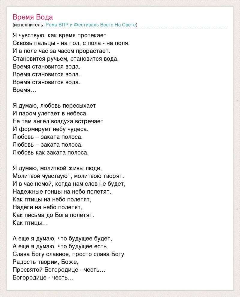 Я чувствую, как время протекает Сквозь пальцы - на пол, с пола - на поля. И в поле час за часом прорастает. Становится ручьем, становится вода. Время становится вода. Время становится вода. Время становится вода. Время… Я думаю, любовь пересыхает И паром улетает в небеса. Ее там ангел воздуха встречает И формирует небу чудеса. Любовь – заката полоса. Любовь – заката полоса. Любовь как заката полоса. Я думаю, молитвой живы люди, Молитвой чувствуют, молитвою творят. И в час немой, когда нам слов не будет, Надежные гонцы на небо полетят. Как птицы на небо полетят, Надёги на небо полетят, Как письма до Бога полетят. Как птицы… А еще я думаю, что будущее будет, А еще я думаю, что будущее есть. Слава Богу славное, просто слава Богу Радость творим, Боже, Пресвятой Богородице - честь… Богородице - честь…