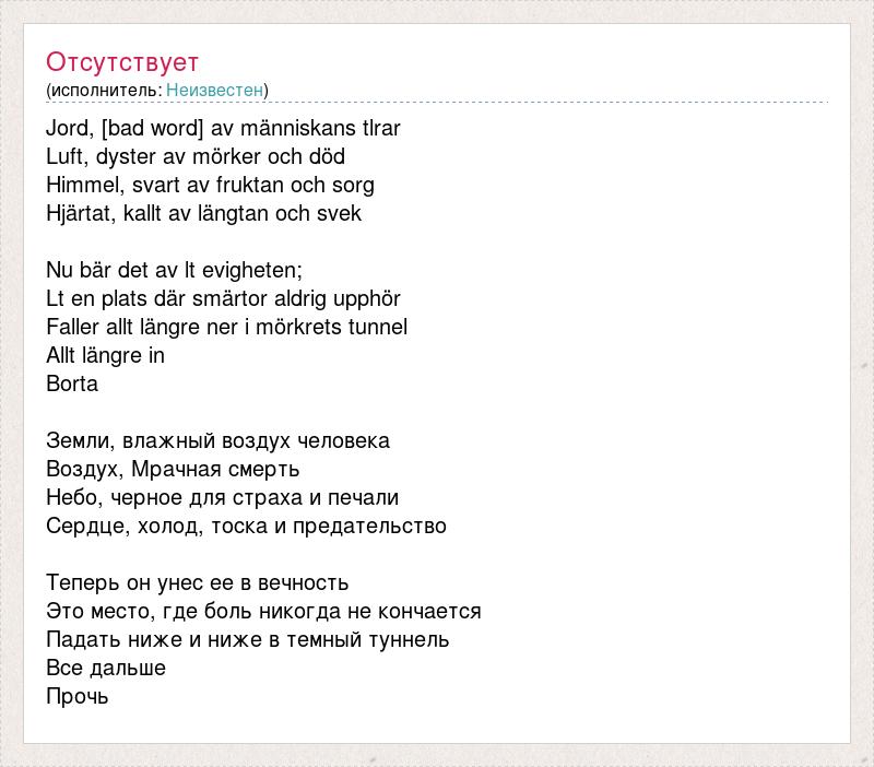 Jord, [bad word] av människans tlrar Luft, dyster av mörker och död Himmel, svart av fruktan och sorg Hjärtat, kallt av längtan och svek Nu bär det av lt evigheten; Lt en plats där smärtor aldrig upphör Faller allt längre ner i mörkrets tunnel Allt längre in Borta Земли, влажный воздух человека Воздух, Мрачная смерть Небо, черное для страха и печали Сердце, холод, тоска и предательство Теперь он унес ее в вечность Это место, где боль никогда не кончается Падать ниже и ниже в темный туннель Все дальше Прочь