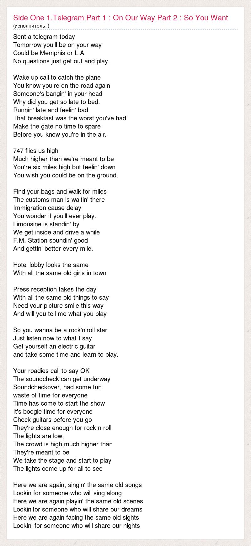 Sent a telegram today Tomorrow you'll be on your way Could be Memphis or L.A. No questions just get out and play. Wake up call to catch the plane You know you're on the road again Someone's bangin' in your head Why did you get so late to bed. Runnin' late and feelin' bad That breakfast was the worst you've had Make the gate no time to spare Before you know you're in the air. 747 flies us high Much higher than we're meant to be You're six miles high but feelin' down You wish you could be on the ground. Find your bags and walk for miles The customs man is waitin' there Immigration cause delay You wonder if you'll ever play. Limousine is standin' by We get inside and drive a while F.M. Station soundin' good And gettin' better every mile. Hotel lobby looks the same With all the same old girls in town Press reception takes the day With all the same old things to say Need your picture smile this way And will you tell me what you play So you wanna be a rock'n'roll star Just listen now to what I say Get yourself an electric guitar and take some time and learn to play. Your roadies call to say OK The soundcheck can get underway Soundcheckover, had some fun waste of time for everyone Time has come to start the show It's boogie time for everyone Check guitars before you go They're close enough for rock n roll The lights are low, The crowd is high,much higher than They're meant to be We take the stage and start to play The lights come up for all to see Here we are again, singin' the same old songs Lookin for someone who will sing along Here we are again playin' the same old scenes Lookin'for someone who will share our dreams Here we are again facing the same old sights Lookin' for someone who will share our nights