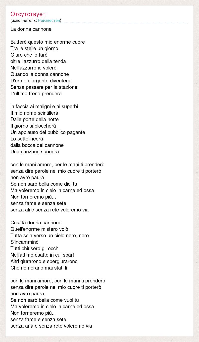 La donna cannone Butterò questo mio enorme cuore Tra le stelle un giorno Giuro che lo farò oltre l'azzurro della tenda Nell'azzurro io volerò Quando la donna cannone D'oro e d'argento diventerà Senza passare per la stazione L'ultimo treno prenderà in faccia ai maligni e ai superbi Il mio nome scintillerà Dalle porte della notte Il giorno si bloccherà Un applauso del pubblico pagante Lo sottolineerà dalla bocca del cannone Una canzone suonerà con le mani amore, per le mani ti prenderò senza dire parole nel mio cuore ti porterò non avrò paura Se non sarò bella come dici tu Ma voleremo in cielo in carne ed ossa Non torneremo più... senza fame e senza sete senza ali e senza rete voleremo via Così la donna cannone Quell'enorme mistero volò Tutta sola verso un cielo nero, nero S'incamminò Tutti chiusero gli occhi Nell'attimo esatto in cui sparì Altri giurarono e spergiurarono Che non erano mai stati lì con le mani amore, con le mani ti prenderò senza dire parole nel mio cuore ti porterò non avrò paura Se non sarò bella come vuoi tu Ma voleremo in cielo in carne ed ossa Non torneremo più.. senza fame e senza sete senza aria e senza rete voleremo via