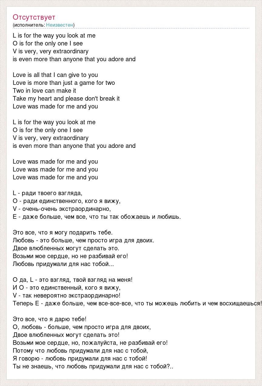 L is for the way you look at me O is for the only one I see V is very, very extraordinary is even more than anyone that you adore and Love is all that I can give to you Love is more than just a game for two Two in love can make it Take my heart and please don't break it Love was made for me and you L is for the way you look at me O is for the only one I see V is very, very extraordinary is even more than anyone that you adore and Love was made for me and you Love was made for me and you Love was made for me and you L - ради твоего взгляда, О - ради единственного, кого я вижу, V - очень-очень экстраординарно, Е - даже больше, чем все, что ты так обожаешь и любишь. Это все, что я могу подарить тебе. Любовь - это больше, чем просто игра для двоих. Двое влюбленных могут сделать это. Возьми мое сердце, но не разбивай его! Любовь придумали для нас тобой... О да, L - это взгляд, твой взгляд на меня! И О - это единственный, кого я вижу, V - так невероятно экстраординарно! Теперь Е - даже больше, чем все-все-все, что ты можешь любить и чем восхищаешься! Это все, что я дарю тебе! О, любовь - больше, чем просто игра для двоих, Двое влюбленных могут сделать это! Возьми мое сердце, но, пожалуйста, не разбивай его! Потому что любовь придумали для нас с тобой, Я говорю - любовь придумали для нас с тобой! Ты не знаешь, что любовь придумали для нас с тобой?..