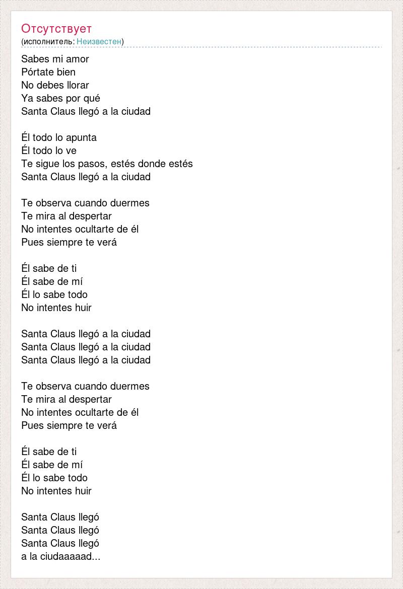 Sabes mi amor Pórtate bien No debes llorar Ya sabes por qué Santa Claus llegó a la ciudad Él todo lo apunta Él todo lo ve Te sigue los pasos, estés donde estés Santa Claus llegó a la ciudad Te observa cuando duermes Te mira al despertar No intentes ocultarte de él Pues siempre te verá Él sabe de ti Él sabe de mí Él lo sabe todo No intentes huir Santa Claus llegó a la ciudad Santa Claus llegó a la ciudad Santa Claus llegó a la ciudad Te observa cuando duermes Te mira al despertar No intentes ocultarte de él Pues siempre te verá Él sabe de ti Él sabe de mí Él lo sabe todo No intentes huir Santa Claus llegó Santa Claus llegó Santa Claus llegó a la ciudaaaaad...