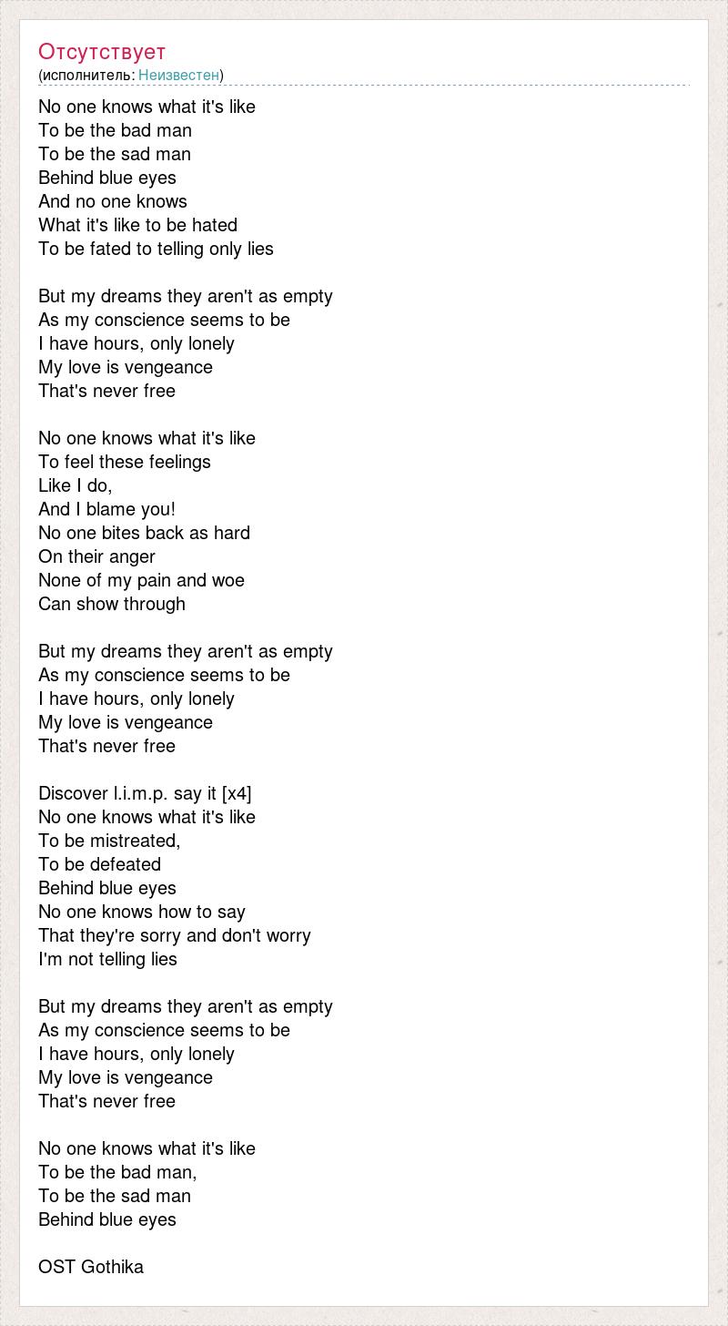 No one knows what it's like To be the bad man To be the sad man Behind blue eyes And no one knows What it's like to be hated To be fated to telling only lies But my dreams they aren't as empty As my conscience seems to be I have hours, only lonely My love is vengeance That's never free No one knows what it's like To feel these feelings Like I do, And I blame you! No one bites back as hard On their anger None of my pain and woe Can show through But my dreams they aren't as empty As my conscience seems to be I have hours, only lonely My love is vengeance That's never free Discover l.i.m.p. say it [x4] No one knows what it's like To be mistreated, To be defeated Behind blue eyes No one knows how to say That they're sorry and don't worry I'm not telling lies But my dreams they aren't as empty As my conscience seems to be I have hours, only lonely My love is vengeance That's never free No one knows what it's like To be the bad man, To be the sad man Behind blue eyes OST Gothika