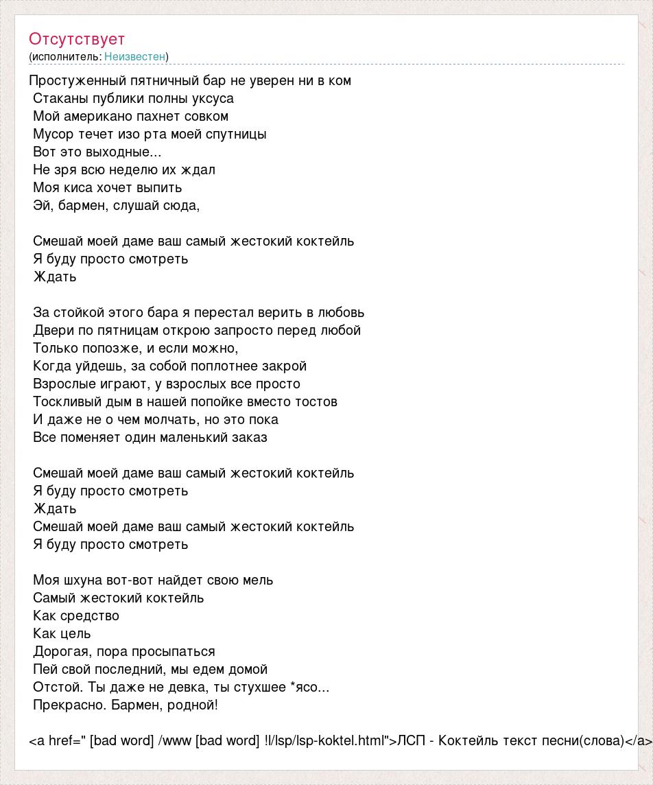 Простуженный пятничный бар не уверен ни в ком Стаканы публики полны уксуса Мой американо пахнет совком Мусор течет изо рта моей спутницы Вот это выходные... Не зря всю неделю их ждал Моя киса хочет выпить Эй, бармен, слушай сюда, Смешай моей даме ваш самый жестокий коктейль Я буду просто смотреть Ждать За стойкой этого бара я перестал верить в любовь Двери по пятницам открою запросто перед любой Только попозже, и если можно, Когда уйдешь, за собой поплотнее закрой Взрослые играют, у взрослых все просто Тоскливый дым в нашей попойке вместо тостов И даже не о чем молчать, но это пока Все поменяет один маленький заказ Смешай моей даме ваш самый жестокий коктейль Я буду просто смотреть Ждать Смешай моей даме ваш самый жестокий коктейль Я буду просто смотреть Моя шхуна вот-вот найдет свою мель Самый жестокий коктейль Как средство Как цель Дорогая, пора просыпаться Пей свой последний, мы едем домой Отстой. Ты даже не девка, ты стухшее *ясо... Прекрасно. Бармен, родной! <a href=" [bad word] /www [bad word] !l/lsp/lsp-koktel.html">ЛСП - Коктейль текст песни(слова)</a>