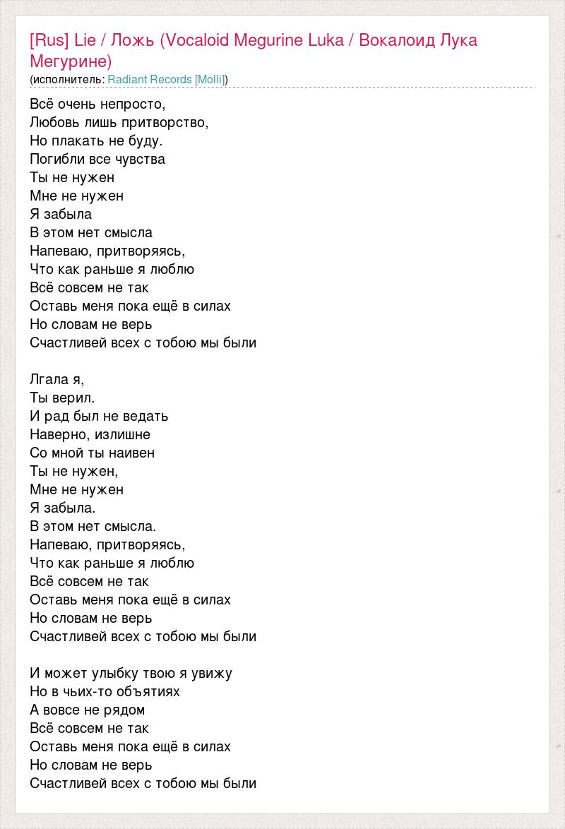 Всё очень непросто, Любовь лишь притворство, Но плакать не буду. Погибли все чувства Ты не нужен Мне не нужен Я забыла В этом нет смысла Напеваю, притворяясь, Что как раньше я люблю Всё совсем не так Оставь меня пока ещё в силах Но словам не верь Счастливей всех с тобою мы были Лгала я, Ты верил. И рад был не ведать Наверно, излишне Со мной ты наивен Ты не нужен, Мне не нужен Я забыла. В этом нет смысла. Напеваю, притворяясь, Что как раньше я люблю Всё совсем не так Оставь меня пока ещё в силах Но словам не верь Счастливей всех с тобою мы были И может улыбку твою я увижу Но в чьих-то объятиях А вовсе не рядом Всё совсем не так Оставь меня пока ещё в силах Но словам не верь Счастливей всех с тобою мы были