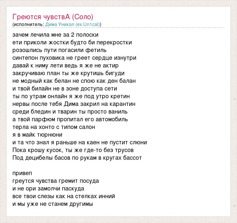 зачем лечила мне за 2 полоски ети приколи жостки будто би перекростки розошлись пути погасили фетиль синтепон пуховика не греет сердце изнутри давай к ниму лети ведь я же не актир закручиваю план ты же крутишь бигуди не модный как белан не спою как ден балан и твой билайн не в зоне доступа сети ты по утрам онлайн я же под утро кретин нервы после тебя Дима закрил на карантин среди бледин и тварин ты просто ваниль а твой парфюм пропитал его автомобиль терла на хонто с типом салон я в майк тюрнюни и та что знал я раньше на каен не пустит слюни Пока крошу кусок, ты же где-то без трусов Под децибелы басов по рукам в кругах бассот привеп греутся чувства гремит посуда и не ори замолчи паскуда все твои слезы как на стелках инний и мы уже не станем другимы