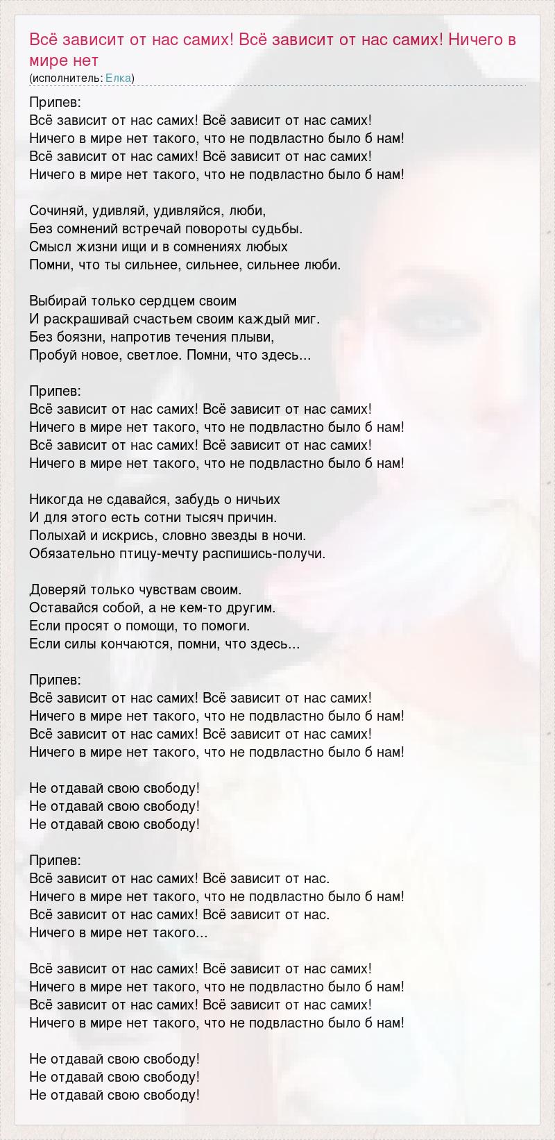 Припев: Всё зависит от нас самих! Всё зависит от нас самих! Ничего в мире нет такого, что не подвластно было б нам! Всё зависит от нас самих! Всё зависит от нас самих! Ничего в мире нет такого, что не подвластно было б нам! Сочиняй, удивляй, удивляйся, люби, Без сомнений встречай повороты судьбы. Смысл жизни ищи и в сомнениях любых Помни, что ты сильнее, сильнее, сильнее люби. Выбирай только сердцем своим И раскрашивай счастьем своим каждый миг. Без боязни, напротив течения плыви, Пробуй новое, светлое. Помни, что здесь... Припев: Всё зависит от нас самих! Всё зависит от нас самих! Ничего в мире нет такого, что не подвластно было б нам! Всё зависит от нас самих! Всё зависит от нас самих! Ничего в мире нет такого, что не подвластно было б нам! Никогда не сдавайся, забудь о ничьих И для этого есть сотни тысяч причин. Полыхай и искрись, словно звезды в ночи. Обязательно птицу-мечту распишись-получи. Доверяй только чувствам своим. Оставайся собой, а не кем-то другим. Если просят о помощи, то помоги. Если силы кончаются, помни, что здесь... Припев: Всё зависит от нас самих! Всё зависит от нас самих! Ничего в мире нет такого, что не подвластно было б нам! Всё зависит от нас самих! Всё зависит от нас самих! Ничего в мире нет такого, что не подвластно было б нам! Не отдавай свою свободу! Не отдавай свою свободу! Не отдавай свою свободу! Припев: Всё зависит от нас самих! Всё зависит от нас. Ничего в мире нет такого, что не подвластно было б нам! Всё зависит от нас самих! Всё зависит от нас. Ничего в мире нет такого... Всё зависит от нас самих! Всё зависит от нас самих! Ничего в мире нет такого, что не подвластно было б нам! Всё зависит от нас самих! Всё зависит от нас самих! Ничего в мире нет такого, что не подвластно было б нам! Не отдавай свою свободу! Не отдавай свою свободу! Не отдавай свою свободу!