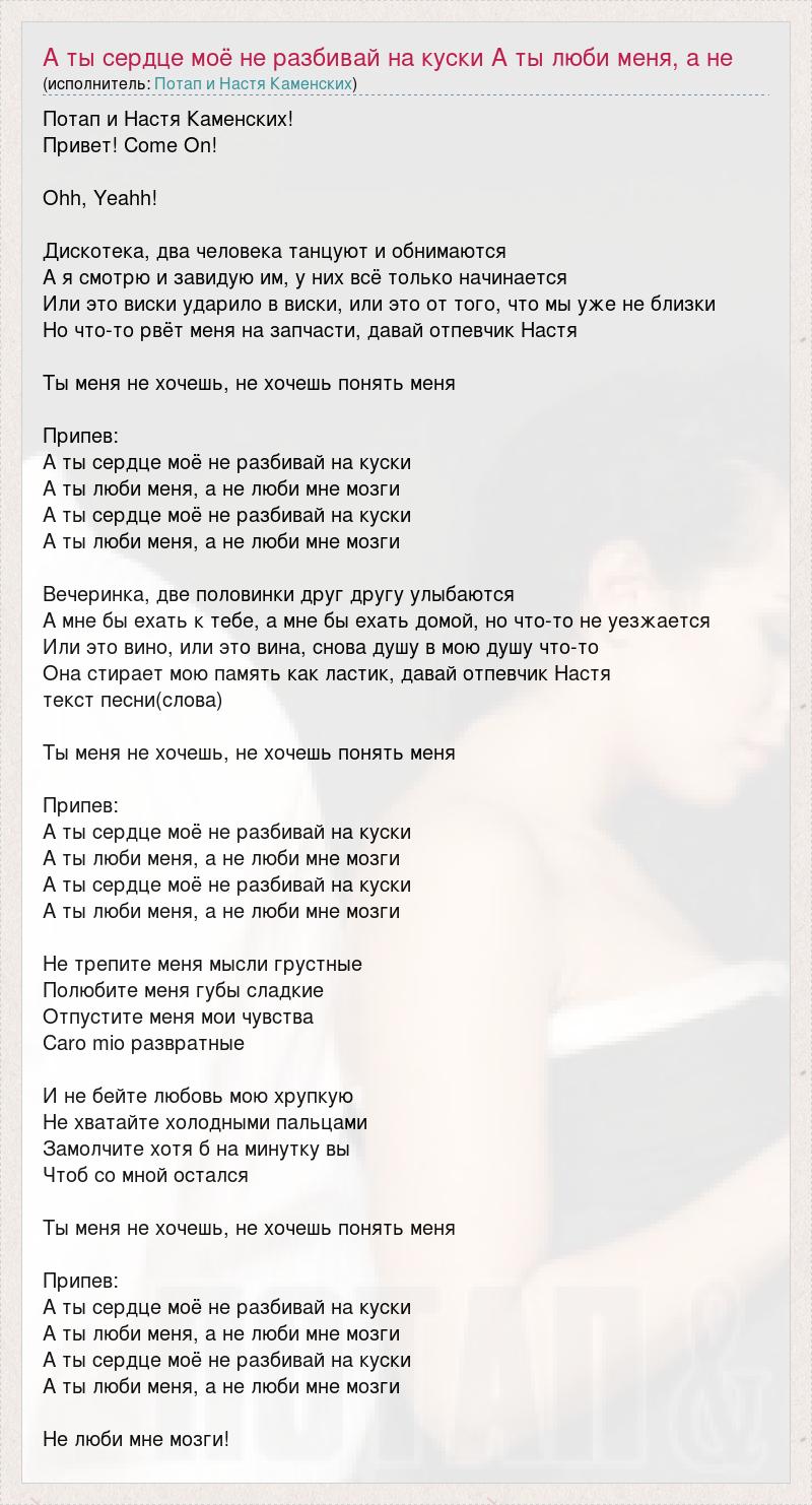 Потап и Настя Каменских! Привет! Come On! Ohh, Yeahh! Дискотека, два человека танцуют и обнимаются А я смотрю и завидую им, у них всё только начинается Или это виски ударило в виски, или это от того, что мы уже не близки Но что-то рвёт меня на запчасти, давай отпевчик Настя Ты меня не хочешь, не хочешь понять меня Припев: А ты сердце моё не разбивай на куски А ты люби меня, а не люби мне мозги А ты сердце моё не разбивай на куски А ты люби меня, а не люби мне мозги Вечеринка, две половинки друг другу улыбаются А мне бы ехать к тебе, а мне бы ехать домой, но что-то не уезжается Или это вино, или это вина, снова душу в мою душу что-то Она стирает мою память как ластик, давай отпевчик Настя текст песни(слова) Ты меня не хочешь, не хочешь понять меня Припев: А ты сердце моё не разбивай на куски А ты люби меня, а не люби мне мозги А ты сердце моё не разбивай на куски А ты люби меня, а не люби мне мозги Не трепите меня мысли грустные Полюбите меня губы сладкие Отпустите меня мои чувства Caro mio развратные И не бейте любовь мою хрупкую Не хватайте холодными пальцами Замолчите хотя б на минутку вы Чтоб со мной остался Ты меня не хочешь, не хочешь понять меня Припев: А ты сердце моё не разбивай на куски А ты люби меня, а не люби мне мозги А ты сердце моё не разбивай на куски А ты люби меня, а не люби мне мозги Не люби мне мозги!