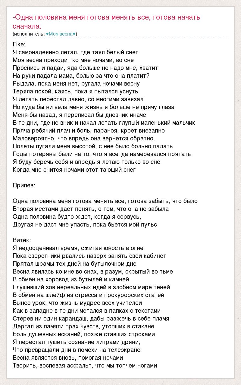 Fike: Я самонадеянно летал, где таял белый снег Моя весна приходит ко мне ночами, во сне Проснись и падай, яда больше не надо мне, хватит На руки падала мама, болью за что она платит? Рыдала, пока меня нет, ругала ночами весну Теряла покой, каясь, пока я пытался уснуть Я летать перестал давно, со многими завязал Но куда бы ни вела меня жизнь я больше не прячу глаза Меня бы назад, я переписал бы дневник иначе В те дни, где не вник и начал летать глупый маленький мальчик Пряча ребячий плач и боль, параноя, кроет внезапно Маловероятно, что впредь она вернется обратно. Полеты пугали меня высотой, с нее было больно падать Годы потеряны были на то, что я всегда намеревался прятать Я буду беречь себя и впредь я летаю только во сне Когда мне снится ночами этот тающий снег Припев: Одна половина меня готова менять все, готова забыть, что было Вторая местами дает понять, о том, что она не забыла Одна половина будто ждет, когда я сорвусь, Другая не даст мне упасть, пока бьется мой пульс Витёк: Я недооценивал время, сжигая юность в огне Пока сверстники рвались наверх занять свой кабинет Прятал шрамы тех дней на бутылочном дне Весна явилась ко мне во снах, в разум, скрытый во тьме В обмен на хоровод из бутылей и камней Глушивший зов нереальных идей в злобном мире теней В обмен на шлейф из стресса и прокурорских статей Вынес урок, что жизнь мудрее всех учителей Как в западне в те дни метался в папках с текстами Стерев ни один карандаш, дабы разжечь в себе пламя Дергал из памяти прах чувств, утопших в стакане Боль душевных исканий, позже ставших строками Я перестал тушить сознание литрами дряни, Что превращали дни в помехи на телеэкране Весна является вновь, помогая ночами Творить, воспевая асфальт, что мы топчем ногами