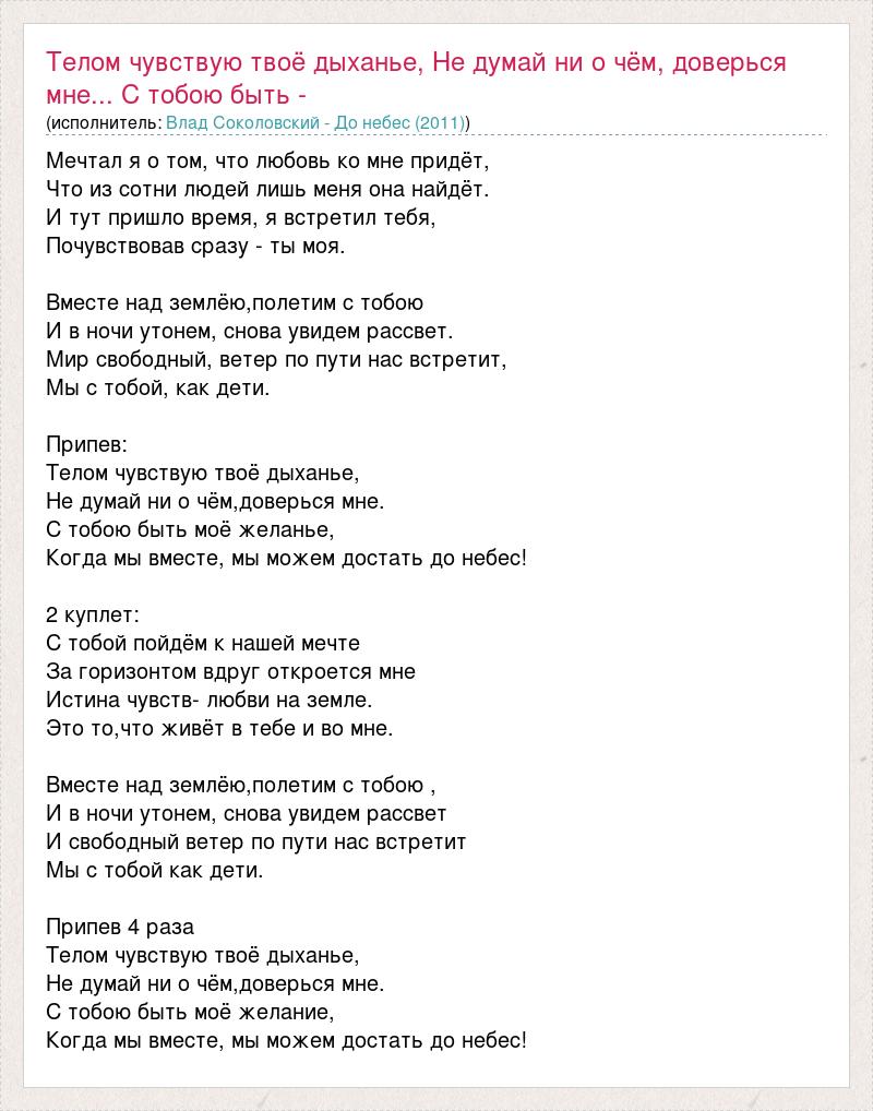 Мечтал я о том, что любовь ко мне придёт, Что из сотни людей лишь меня она найдёт. И тут пришло время, я встретил тебя, Почувствовав сразу - ты моя. Вместе над землёю,полетим с тобою И в ночи утонем, снова увидем рассвет. Мир свободный, ветер по пути нас встретит, Мы с тобой, как дети. Припев: Телом чувствую твоё дыханье, Не думай ни о чём,доверься мне. С тобою быть моё желанье, Когда мы вместе, мы можем достать до небес! 2 куплет: С тобой пойдём к нашей мечте За горизонтом вдруг откроется мне Истина чувств- любви на земле. Это то,что живёт в тебе и во мне. Вместе над землёю,полетим с тобою , И в ночи утонем, снова увидем рассвет И свободный ветер по пути нас встретит Мы с тобой как дети. Припев 4 раза Телом чувствую твоё дыханье, Не думай ни о чём,доверься мне. С тобою быть моё желание, Когда мы вместе, мы можем достать до небес!
