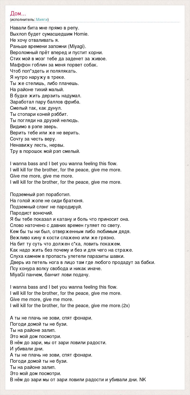 Навали бита мне прямо в репу. Выхлоп будет сумасшедшим Homie. Не хочу отваливать я. Раньше времени запомни (Miyagi). Вероломный прёт вперед и пустит корни. Стих мой в мозг тебе да заденет за живое. Маффон гоблин за меня порвет собак. Чтоб поп*здеть и полялякать. Я нутро наружу в треке. Ты же стелишь, либо плачешь. На районе тихий малый. В будке жить дерзить надумал. Заработал пару баллов фриба. Смелый так, как дунул. Ты стопари коней рэббит. Ты погляди на друзей нелюдь. Видимо в рэпе зверь. Верить тебе или же не верить. Сочту за честь веру. Ненавижу лесть, нервы. Тру в порошок мой рэп смелый. I wanna bass and I bet you wanna feeling this flow. I will kill for the brother, for the peace, give me more. Give me more, give me more. I will kill for the brother, for the peace, give me more. Подземный рэп поработил. На голой жопе не сиди братюня. Подземный слэнг не пародируй. Пародист вонючий. Я бы тебе показал и катану и боль что приносит она. Слово наточено с давних времен гуляет по свету. Кем бы ты ни был, отверженным либо любимым дядя. Вежливо кину я кости слажено или же грязно. На бит ту суть что должен с*ка, ловить покажем. Как надо жить без почему и без и для чего на страже. Слуха камнем в пропасть улетели паразиты шавки. Дверь из петель нога в лицо там где любого продадут за бабки. Псу конура волку свобода и никак иначе. MiyaGi панчем, банчит лови подачу. I wanna bass and I bet you wanna feeling this flow. I will kill for the brother, for the peace, give me more. Give me more, give me more. I will kill for the brother, for the peace, give me more.(2х) А ты не плачь не зови, спят фонари. Погоди домой ты не бузи. Ты на районе залип. Это мой дом посмотри. В нём до зари, мы от зари ловили радости. И убивали дни. А ты не плачь не зови, спят фонари. Погоди домой ты не бузи. Ты на районе залип. Это мой дом посмотри. В нём до зари мы от зари ловили радости и убивали дни. NK
