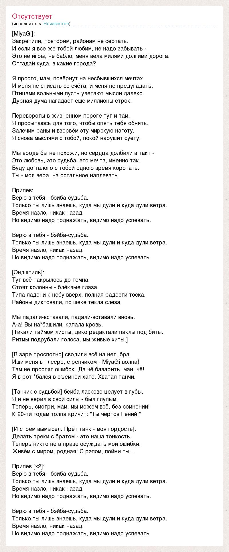 [MiyaGi]: Закрепили, повторим, районам не сертать. И если я все же тобой любим, не надо забывать - Это не игры, не бабло, меня вела милями долгими дорога. Отгадай куда, в какие города? Я просто, мам, повёрнут на несбывшихся мечтах. И меня не списать со счёта, и меня не предугадать. Птицами вольными пусть улетают мысли далеко. Дурная дума нагадает еще миллионы строк. Перевороты в жизненном пороге тут и там. Я просыпаюсь для того, чтобы опять тебя обнять. Залечим раны и взорвём эту мирскую наготу. Я снова мыслями с тобой, покой нарушит суету. Мы вроде бы не похожи, но сердца долбили в такт - Это любовь, это судьба, это мечта, именно так. Буду до талого с тобой одною время коротать. Ты - моя вера, на остальное наплевать. Припев: Верю в тебя - бэйба-судьба. Только ты лишь знаешь, куда мы дули и куда дули ветра. Время назло, никак назад. Но видимо надо поднажать, видимо надо успевать. Верю в тебя - бэйба-судьба. Только ты лишь знаешь, куда мы дули и куда дули ветра. Время назло, никак назад. Но видимо надо поднажать, видимо надо успевать. [Эндшпиль]: Тут всё накрылось до темна. Стоят колонны - блёклые глаза. Типа ладони к небу вверх, полная радости тоска. Районы диктовали, по щеке текла слеза. Мы падали-вставали, падали-вставали вновь. А-а! Вы на*башили, капала кровь. [Тикали таймом листы, дико редактали паклы под биты. Ритмы подрубали голоса, мы живые хиты.] [В заре проспотно] сводили всё на нет, бра. Ищи меня в плеере, с репчиком - MiyaGi-волна! Там не простят ошибок. Да чё базарить, ман, чё! Я в рот *бался в съемной хате. Хватал панчи. [Танчик с судьбой] бейба ласково целует в губы. Я и не верил в свои силы - был глупым. Теперь, смотри, мам, мы можем всё, без сомнений! К 20-ти годам толпа кричит: "Ты чёртов Гений!" [И стрём вымысел. Прёт танк - моя гордость]. Делать треки с братом - это наша тонкость. Теперь никто не в праве осуждать мои ошибки. Живём с миром, родная! С рэпом, пойми ты... Припев [x2]: Верю в тебя - бэйба-судьба. Только ты лишь знаешь, куда мы дули и куда дули ветра. Время назло, никак назад. Но видимо надо поднажать, видимо надо успевать. Верю в тебя - бэйба-судьба. Только ты лишь знаешь, куда мы дули и куда дули ветра. Время назло, никак назад. Но видимо надо поднажать, видимо надо успевать.