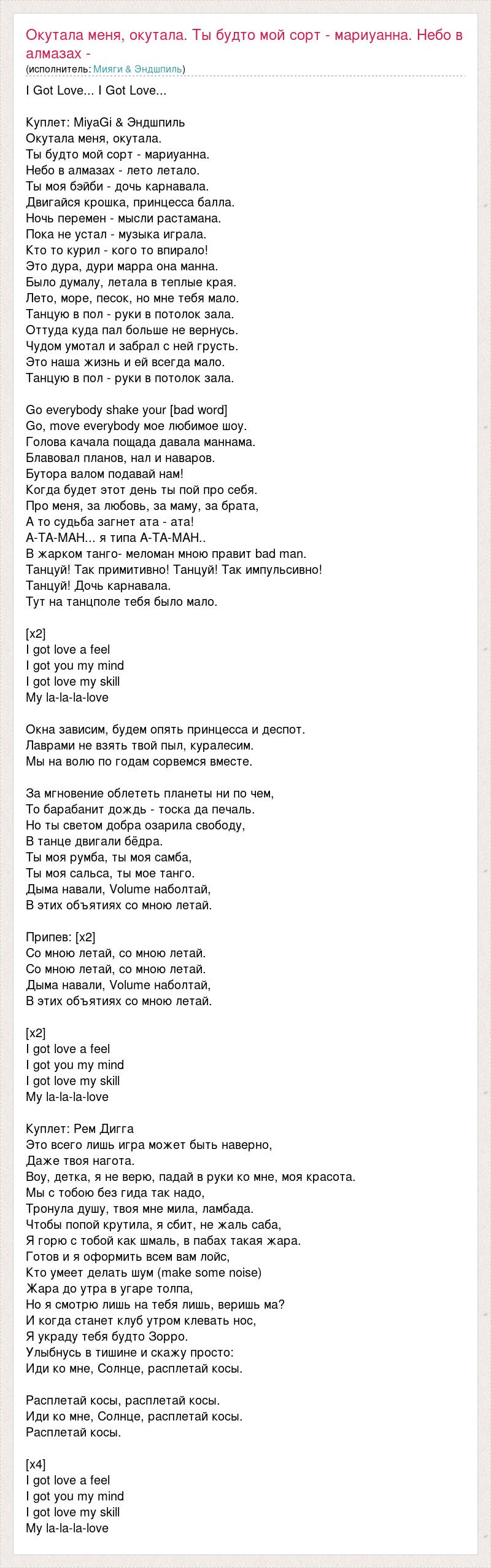 I Got Love... I Got Love... Куплет: MiyaGi & Эндшпиль Окутала меня, окутала. Ты будто мой сорт - мариуанна. Небо в алмазах - лето летало. Ты моя бэйби - дочь карнавала. Двигайся крошка, принцесса балла. Ночь перемен - мысли растамана. Пока не устал - музыка играла. Кто то курил - кого то впирало! Это дура, дури марра она манна. Было думалу, летала в теплые края. Лето, море, песок, но мне тебя мало. Танцую в пол - руки в потолок зала. Оттуда куда пал больше не вернусь. Чудом умотал и забрал с ней грусть. Это наша жизнь и ей всегда мало. Танцую в пол - руки в потолок зала. Go everybody shake your [bad word] Go, move everybody мое любимое шоу. Голова качала пощада давала маннама. Блавовал планов, нал и наваров. Бутора валом подавай нам! Когда будет этот день ты пой про себя. Про меня, за любовь, за маму, за брата, А то судьба загнет ата - ата! А-ТА-МАН... я типа А-ТА-МАН.. В жарком танго- меломан мною правит bad man. Танцуй! Так примитивно! Танцуй! Так импульсивно! Танцуй! Дочь карнавала. Тут на танцполе тебя было мало. [x2] I got love a feel I got you my mind I got love my skill My la-la-la-love Окна зависим, будем опять принцесса и деспот. Лаврами не взять твой пыл, куралесим. Мы на волю по годам сорвемся вместе. За мгновение облететь планеты ни по чем, То барабанит дождь - тоска да печаль. Но ты светом добра озарила свободу, В танце двигали бёдра. Ты моя румба, ты моя самба, Ты моя сальса, ты мое танго. Дыма навали, Volume наболтай, В этих объятиях со мною летай. Припев: [х2] Со мною летай, со мною летай. Со мною летай, со мною летай. Дыма навали, Volume наболтай, В этих объятиях со мною летай. [х2] I got love a feel I got you my mind I got love my skill My la-la-la-love Куплет: Рем Дигга Это всего лишь игра может быть наверно, Даже твоя нагота. Воу, детка, я не верю, падай в руки ко мне, моя красота. Мы с тобою без гида так надо, Тронула душу, твоя мне мила, ламбада. Чтобы попой крутила, я сбит, не жаль саба, Я горю с тобой как шмаль, в пабах такая жара. Готов и я оформить всем вам лойс, Кто умеет делать шум (make some noise) Жара до утра в угаре толпа, Но я смотрю лишь на тебя лишь, веришь ма? И когда станет клуб утром клевать нос, Я украду тебя будто Зорро. Улыбнусь в тишине и скажу просто: Иди ко мне, Солнце, расплетай косы. Расплетай косы, расплетай косы. Иди ко мне, Солнце, расплетай косы. Расплетай косы. [x4] I got love a feel I got you my mind I got love my skill My la-la-la-love