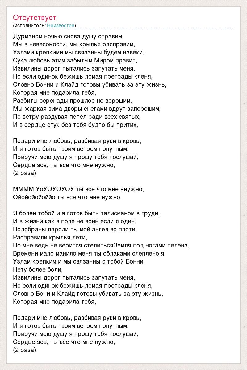 Дурманом ночью снова душу отравим, Мы в невесомости, мы крылья расправим, Узлами крепкими мы связанны будем навеки, Сука любовь этим забытым Миром правит, Извилины дорог пытались запутать меня, Но если одинок бежишь ломая преграды кленя, Словно Бонни и Клайд готовы убивать за эту жизнь, Которая мне подарила тебя, Разбиты серенады прошлое не ворошим, Мы жаркая зима дворы снегами вдруг запорошим, По ветру раздувая пепел ради всех святых, И в сердце стук без тебя будто бы притих, Подари мне любовь, разбивая руки в кровь, И я готов быть твоим ветром попутным, Приручи мою душу я прошу тебя послушай, Сердце зов, ты все что мне нужно, (2 раза) ММММ УоУОУОУОУ ты все что мне неужно, Ойойойойоййо ты все что мне нужно, Я болен тобой и я готов быть талисманом в груди, И в жизни как в поле не воин если я один, Подобраны пароли ты мой ангел во плоти, Расправили крылья лети, Но мне ведь не верится стелитьсяЗемля под ногами пелена, Времени мало манило меня ты облаками слеплено я, Узлам крепким и мы связанны с тобой Бонни, Нету более боли, Извилины дорог пытались запутать меня, Но если одинок бежишь ломая преграды кленя, Словно Бони и Клайд готовы убивать за эту жизнь, Которая мне подарила тебя, Подари мне любовь, разбивая руки в кровь, И я готов быть твоим ветром попутным, Приручи мою душу я прошу тебя послушай, Сердце зов, ты все что мне нужно, (2 раза)