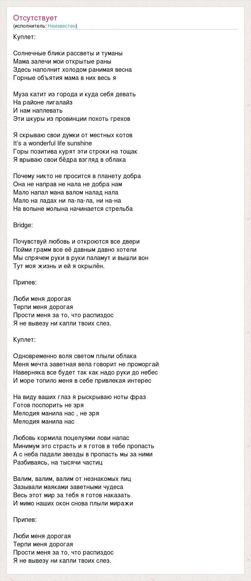 Куплет: Солнечные блики рассветы и туманы Мама залечи мои открытые раны Здесь наполнит холодом ранимая весна Горные объятия мама в них весь я Муза катит из города и куда себя девать На районе лигалайз И нам наплевать Эти шкуры из провинции похоть грехов Я скрываю свои думки от местных котов It’s a wonderful life sunshine Горы позитива курят эти строки на тощак Я врываю свои бёдра взгляд в облака Почему никто не просится в планету добра Она не направ не нала не добра нам Мало напал мана валом налад нала Мало на ладах ни ла-ла-ла, ни на-на На волыне молына начинается стрельба Bridge: Почувствуй любовь и откроются все двери Пойми грамм все её давным давно хотели Мы спрячем руки в руки паламут и вышли вон Тут моя жизнь и ей я окрылён. Припев: Люби меня дорогая Терпи меня дорогая Прости меня за то, что распиздос Я не вывезу ни капли твоих слез. Куплет: Одновременно воля светом плыли облака Меня мечта заветная вела говорит не проморгай Наверняка все будет так как надо руки до небес И море топило меня в себе привлекая интерес На виду ваших глаз я рыскрываю ноты фраз Готов поспорить не зря Мелодия манила нас , не зря Мелодия манила нас Любовь кормила поцелуями лови напас Минимум это страсть и я готов в тебе пропасть А с неба падали звезды в пропасть мы за ними Разбиваясь, на тысячи частиц Валим, валим, валим от незнакомых лиц Зазывали маяками заветными чудеса Весь этот мир за тебя я готов наказать И мимо наших окон снова плыли миражи Припев: Люби меня дорогая Терпи меня дорогая Прости меня за то, что распиздос Я не вывезу ни капли твоих слез.