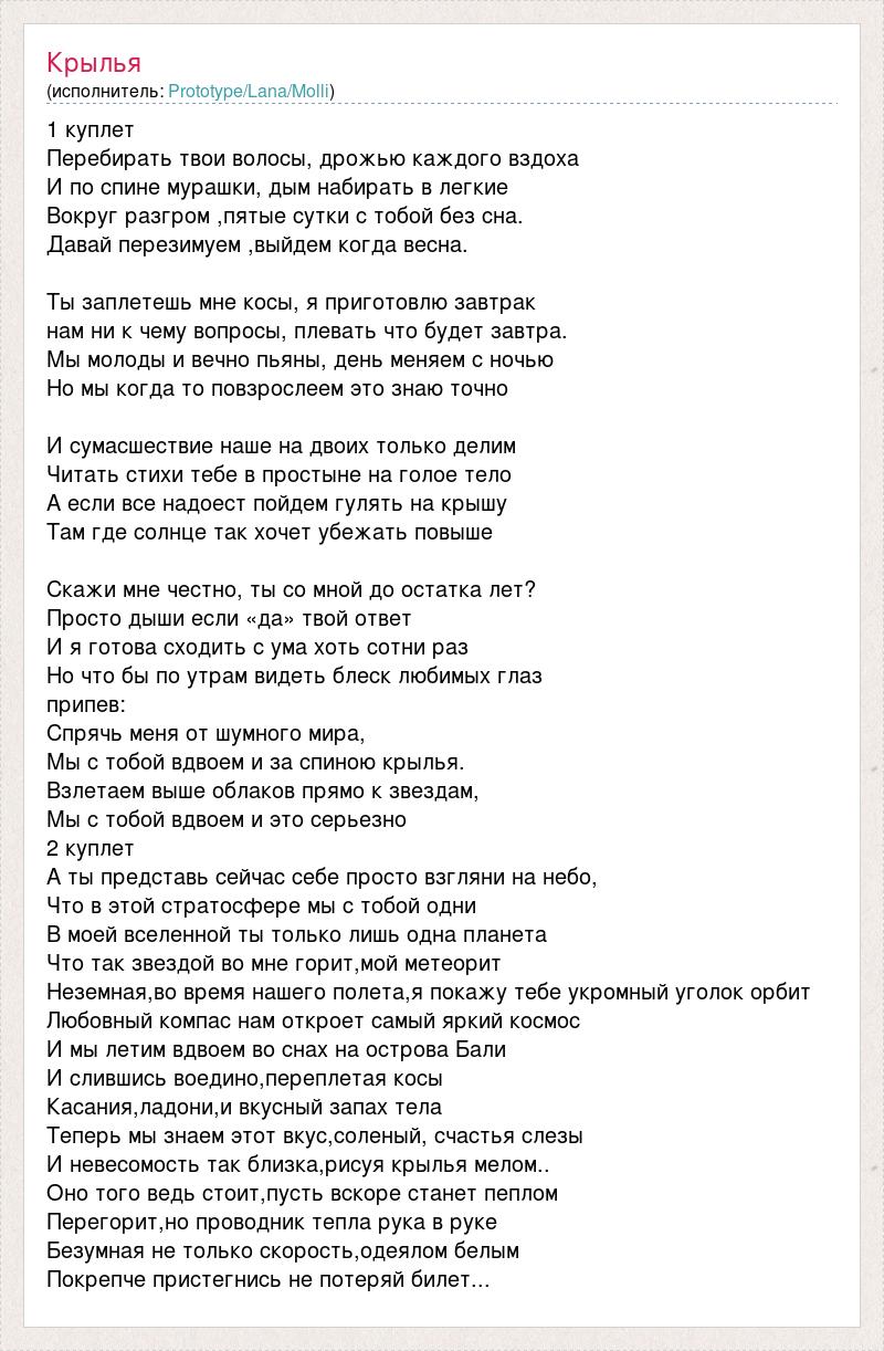 1 куплет Перебирать твои волосы, дрожью каждого вздоха И по спине мурашки, дым набирать в легкие Вокруг разгром ,пятые сутки с тобой без сна. Давай перезимуем ,выйдем когда весна. Ты заплетешь мне косы, я приготовлю завтрак нам ни к чему вопросы, плевать что будет завтра. Мы молоды и вечно пьяны, день меняем с ночью Но мы когда то повзрослеем это знаю точно И сумасшествие наше на двоих только делим Читать стихи тебе в простыне на голое тело А если все надоест пойдем гулять на крышу Там где солнце так хочет убежать повыше Скажи мне честно, ты со мной до остатка лет? Просто дыши если «да» твой ответ И я готова сходить с ума хоть сотни раз Но что бы по утрам видеть блеск любимых глаз припев: Спрячь меня от шумного мира, Мы с тобой вдвоем и за спиною крылья. Взлетаем выше облаков прямо к звездам, Мы с тобой вдвоем и это серьезно 2 куплет А ты представь сейчас себе просто взгляни на небо, Что в этой стратосфере мы с тобой одни В моей вселенной ты только лишь одна планета Что так звездой во мне горит,мой метеорит Неземная,во время нашего полета,я покажу тебе укромный уголок орбит Любовный компас нам откроет самый яркий космос И мы летим вдвоем во снах на острова Бали И слившись воедино,переплетая косы Касания,ладони,и вкусный запах тела Теперь мы знаем этот вкус,соленый, счастья слезы И невесомость так близка,рисуя крылья мелом.. Оно того ведь стоит,пусть вскоре станет пеплом Перегорит,но проводник тепла рука в руке Безумная не только скорость,одеялом белым Покрепче пристегнись не потеряй билет...