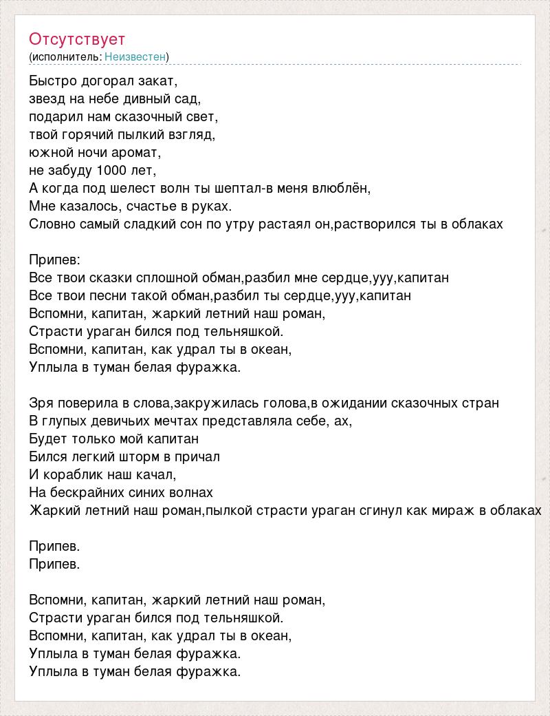 Быстро догорал закат, звезд на небе дивный сад, подарил нам сказочный свет, твой горячий пылкий взгляд, южной ночи аромат, не забуду 1000 лет, А когда под шелест волн ты шептал-в меня влюблён, Мне казалось, счастье в руках. Словно самый сладкий сон по утру растаял он,растворился ты в облаках Припев: Все твои сказки сплошной обман,разбил мне сердце,ууу,капитан Все твои песни такой обман,разбил ты сердце,ууу,капитан Вспомни, капитан, жаркий летний наш роман, Страсти ураган бился под тельняшкой. Вспомни, капитан, как удрал ты в океан, Уплыла в туман белая фуражка. Зря поверила в слова,закружилась голова,в ожидании сказочных стран В глупых девичьих мечтах представляла себе, ах, Будет только мой капитан Бился легкий шторм в причал И кораблик наш качал, На бескрайних синих волнах Жаркий летний наш роман,пылкой страсти ураган сгинул как мираж в облаках Припев. Припев. Вспомни, капитан, жаркий летний наш роман, Страсти ураган бился под тельняшкой. Вспомни, капитан, как удрал ты в океан, Уплыла в туман белая фуражка. Уплыла в туман белая фуражка.