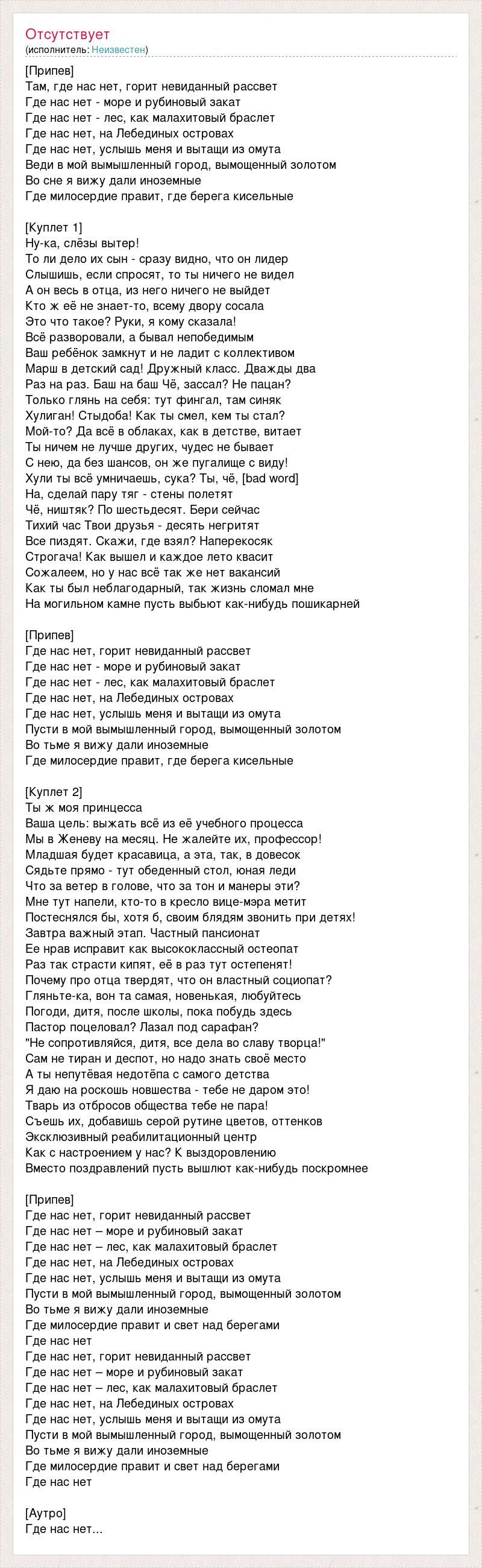 [Припев] Там, где нас нет, горит невиданный рассвет Где нас нет - море и рубиновый закат Где нас нет - лес, как малахитовый браслет Где нас нет, на Лебединых островах Где нас нет, услышь меня и вытащи из омута Веди в мой вымышленный город, вымощенный золотом Во сне я вижу дали иноземные Где милосердие правит, где берега кисельные [Куплет 1] Ну-ка, слёзы вытер! То ли дело их сын - сразу видно, что он лидер Слышишь, если спросят, то ты ничего не видел А он весь в отца, из него ничего не выйдет Кто ж её не знает-то, всему двору сосала Это что такое? Руки, я кому сказала! Всё разворовали, а бывал непобедимым Ваш ребёнок замкнут и не ладит с коллективом Марш в детский сад! Дружный класс. Дважды два Раз на раз. Баш на баш Чё, зассал? Не пацан? Только глянь на себя: тут фингал, там синяк Хулиган! Стыдоба! Как ты смел, кем ты стал? Мой-то? Да всё в облаках, как в детстве, витает Ты ничем не лучше других, чудес не бывает С нею, да без шансов, он же пугалище с виду! Хули ты всё умничаешь, сука? Ты, чё, [bad word] На, сделай пару тяг - стены полетят Чё, ништяк? По шестьдесят. Бери сейчас Тихий час Твои друзья - десять негритят Все пиздят. Скажи, где взял? Наперекосяк Строгача! Как вышел и каждое лето квасит Сожалеем, но у нас всё так же нет вакансий Как ты был неблагодарный, так жизнь сломал мне На могильном камне пусть выбьют как-нибудь пошикарней [Припев] Где нас нет, горит невиданный рассвет Где нас нет - море и рубиновый закат Где нас нет - лес, как малахитовый браслет Где нас нет, на Лебединых островах Где нас нет, услышь меня и вытащи из омута Пусти в мой вымышленный город, вымощенный золотом Во тьме я вижу дали иноземные Где милосердие правит, где берега кисельные [Куплет 2] Ты ж моя принцесса Ваша цель: выжать всё из её учебного процесса Мы в Женеву на месяц. Не жалейте их, профессор! Младшая будет красавица, а эта, так, в довесок Сядьте прямо - тут обеденный стол, юная леди Что за ветер в голове, что за тон и манеры эти? Мне тут напели, кто-то в кресло вице-мэра метит Постеснялся бы, хотя б, своим блядям звонить при детях! Завтра важный этап. Частный пансионат Ее нрав исправит как высококлассный остеопат Раз так страсти кипят, её в раз тут остепенят! Почему про отца твердят, что он властный социопат? Гляньте-ка, вон та самая, новенькая, любуйтесь Погоди, дитя, после школы, пока побудь здесь Пастор поцеловал? Лазал под сарафан? "Не сопротивляйся, дитя, все дела во славу творца!" Сам не тиран и деспот, но надо знать своё место А ты непутёвая недотёпа с самого детства Я даю на роскошь новшества - тебе не даром это! Тварь из отбросов общества тебе не пара! Съешь их, добавишь серой рутине цветов, оттенков Эксклюзивный реабилитационный центр Как с настроением у нас? К выздоровлению Вместо поздравлений пусть вышлют как-нибудь поскромнее [Припев] Где нас нет, горит невиданный рассвет Где нас нет – море и рубиновый закат Где нас нет – лес, как малахитовый браслет Где нас нет, на Лебединых островах Где нас нет, услышь меня и вытащи из омута Пусти в мой вымышленный город, вымощенный золотом Во тьме я вижу дали иноземные Где милосердие правит и свет над берегами Где нас нет Где нас нет, горит невиданный рассвет Где нас нет – море и рубиновый закат Где нас нет – лес, как малахитовый браслет Где нас нет, на Лебединых островах Где нас нет, услышь меня и вытащи из омута Пусти в мой вымышленный город, вымощенный золотом 
