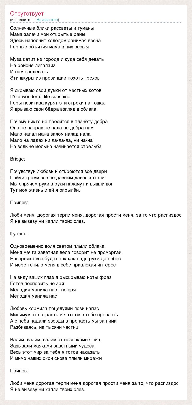 Солнечные блики рассветы и туманы Мама залечи мои открытые раны Здесь наполнит холодом ранимая весна Горные объятия мама в них весь я Муза катит из города и куда себя девать На районе лигалайз И нам наплевать Эти шкуры из провинции похоть грехов Я скрываю свои думки от местных котов It’s a wonderful life sunshine Горы позитива курят эти строки на тощак Я врываю свои бёдра взгляд в облака Почему никто не просится в планету добра Она не направ не нала не добра нам Мало напал мана валом налад нала Мало на ладах ни ла-ла-ла, ни на-на На волыне молына начинается стрельба Bridge: Почувствуй любовь и откроются все двери Пойми грамм все её давным давно хотели Мы спрячем руки в руки паламут и вышли вон Тут моя жизнь и ей я окрылён. Припев: Люби меня, дорогая терпи меня, дорогая прости меня, за то что распиздос Я не вывезу ни капли твоих слез. Куплет: Одновременно воля светом плыли облака Меня мечта заветная вела говорит не проморгай Наверняка все будет так как надо руки до небес И море топило меня в себе привлекая интерес На виду ваших глаз я рыскрываю ноты фраз Готов поспорить не зря Мелодия манила нас , не зря Мелодия манила нас Любовь кормила поцелуями лови напас Минимум это страсть и я готов в тебе пропасть А с неба падали звезды в пропасть мы за ними Разбиваясь, на тысячи частиц Валим, валим, валим от незнакомых лиц Зазывали маяками заветными чудеса Весь этот мир за тебя я готов наказать И мимо наших окон снова плыли миражи Припев: Люби меня дорогая терпи меня дорогая прости меня за то, что распиздос Я не вывезу ни капли твоих слез.