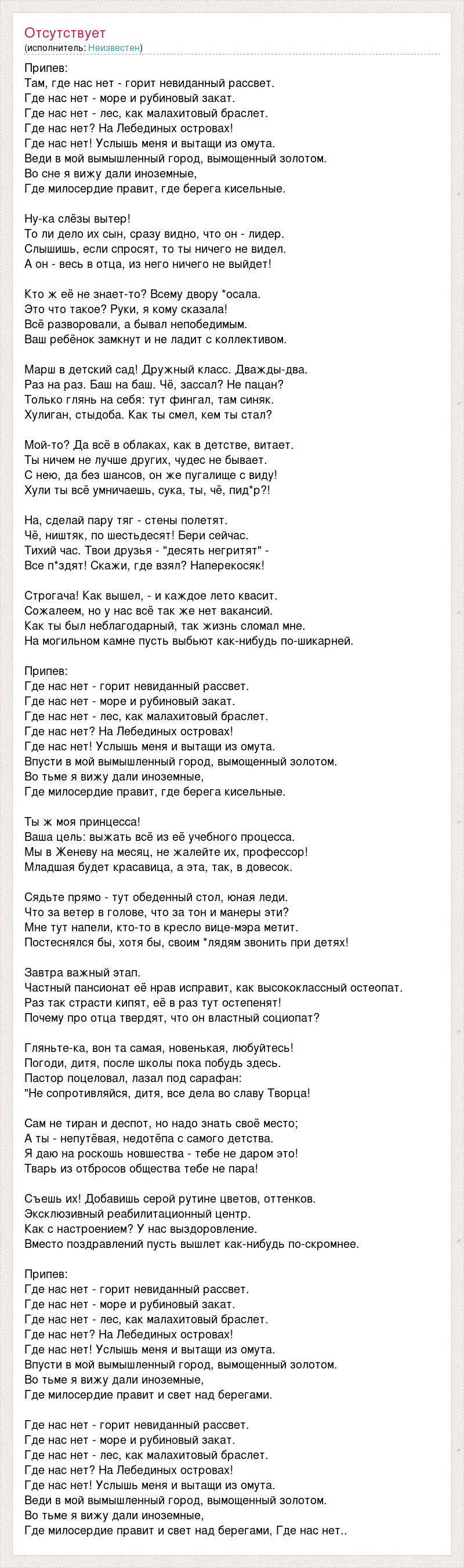 Припев: Там, где нас нет - горит невиданный рассвет. Где нас нет - море и рубиновый закат. Где нас нет - лес, как малахитовый браслет. Где нас нет? На Лебединых островах! Где нас нет! Услышь меня и вытащи из омута. Веди в мой вымышленный город, вымощенный золотом. Во сне я вижу дали иноземные, Где милосердие правит, где берега кисельные. Ну-ка слёзы вытер! То ли дело их сын, сразу видно, что он - лидер. Слышишь, если спросят, то ты ничего не видел. А он - весь в отца, из него ничего не выйдет! Кто ж её не знает-то? Всему двору *осала. Это что такое? Руки, я кому сказала! Всё разворовали, а бывал непобедимым. Ваш ребёнок замкнут и не ладит с коллективом. Марш в детский сад! Дружный класс. Дважды-два. Раз на раз. Баш на баш. Чё, зассал? Не пацан? Только глянь на себя: тут фингал, там синяк. Хулиган, стыдоба. Как ты смел, кем ты стал? Мой-то? Да всё в облаках, как в детстве, витает. Ты ничем не лучше других, чудес не бывает. С нею, да без шансов, он же пугалище с виду! Хули ты всё умничаешь, сука, ты, чё, пид*р?! На, сделай пару тяг - стены полетят. Чё, ништяк, по шестьдесят! Бери сейчас. Тихий час. Твои друзья - "десять негритят" - Все п*здят! Скажи, где взял? Наперекосяк! Строгача! Как вышел, - и каждое лето квасит. Сожалеем, но у нас всё так же нет вакансий. Как ты был неблагодарный, так жизнь сломал мне. На могильном камне пусть выбьют как-нибудь по-шикарней. Припев: Где нас нет - горит невиданный рассвет. Где нас нет - море и рубиновый закат. Где нас нет - лес, как малахитовый браслет. Где нас нет? На Лебединых островах! Где нас нет! Услышь меня и вытащи из омута. Впусти в мой вымышленный город, вымощенный золотом. Во тьме я вижу дали иноземные, Где милосердие правит, где берега кисельные. Ты ж моя принцесса! Ваша цель: выжать всё из её учебного процесса. Мы в Женеву на месяц, не жалейте их, профессор! Младшая будет красавица, а эта, так, в довесок. Сядьте прямо - тут обеденный стол, юная леди. Что за ветер в голове, что за тон и манеры эти? Мне тут напели, кто-то в кресло вице-мэра метит. Постеснялся бы, хотя бы, своим *лядям звонить при детях! Завтра важный этап. Частный пансионат её нрав исправит, как высококлассный остеопат. Раз так страсти кипят, её в раз тут остепенят! Почему про отца твердят, что он властный социопат? Гляньте-ка, вон та самая, новенькая, любуйтесь! Погоди, дитя, после школы пока побудь здесь. Пастор поцеловал, лазал под сарафан: "Не сопротивляйся, дитя, все дела во славу Творца! Сам не тиран и деспот, но надо знать своё место; А ты - непутёвая, недотёпа с самого детства. Я даю на роскошь новшества - тебе не даром это! Тварь из отбросов общества тебе не пара! Съешь их! Добавишь серой рутине цветов, оттенков. Эксклюзивный реабилитационный центр. Как с настроением? У нас выздоровление. Вместо поздравлений пусть вышлет как-нибудь по-скромнее. Припев: Где нас нет - горит невиданный рассвет. Где нас нет - море и рубиновый закат. Где нас нет - лес, как малахитовый браслет. Где нас нет? На Лебединых островах! Где нас нет! Услышь меня и вытащи из омута. Впусти в мой вымышленный город, вымощенный золотом. Во тьме я вижу дали иноземные, Где милосердие правит и свет над берегами. Где нас нет - горит невиданный рассвет. Где нас нет - море и рубиновый закат. Где нас нет - лес, как малахитовый браслет. Где нас нет? На Лебединых островах! Где нас нет! Услышь меня и вытащи из омута. Веди в мой вымышленный город, вымощенный з