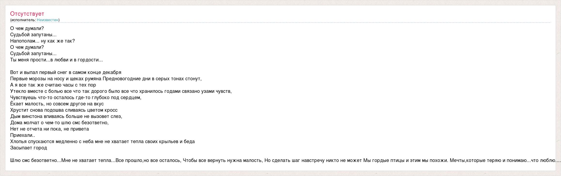О чем думали? Судьбой запутаны... Напополам... ну как же так? О чем думали? Судьбой запутаны... Ты меня прости...в любви и в гордости... Вот и выпал первый снег в самом конце декабря Первые морозы на носу и щеках румяна Предновогодние дни в серых тонах стонут, А я все так же считаю часы с тех пор Утекло вместе с болью все что так дорого было все что хранилось годами связано узами чувств, Чувствуешь что-то осталось где-то глубоко под сердцем, Ёкает малость, но совсем другое на вкус Хрустит снова подошва сливаясь цветом кросс Дым винстона впиваясь больше не вызовет слез, Дома молчат о чем-то шлю смс безответно, Нет не отчета ни пока, не привета Приехали.. Хлопья спускаются медленно с неба мне не хватает тепла своих крыльев и беда Засыпает город Шлю смс безответно...Мне не хватает тепла...Все прошло,но все осталось, Чтобы все вернуть нужна малость, Но сделать шаг навстречу никто не может Мы гордые птицы и этим мы похожи. Мечты,которые теряю и понимаю...что люблю....