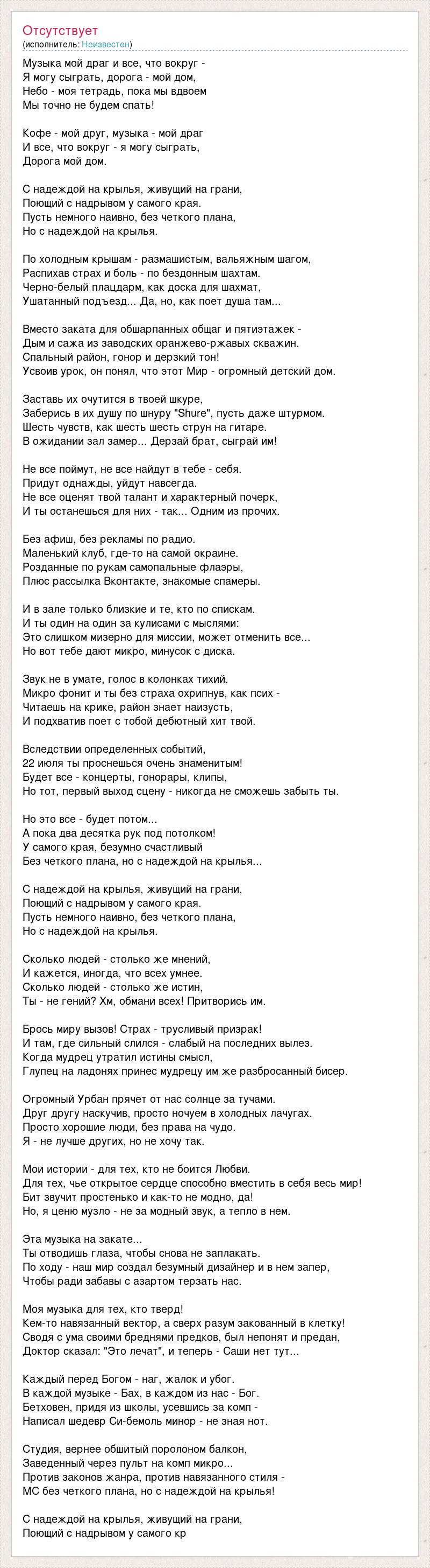 Музыка мой драг и все, что вокруг - Я могу сыграть, дорога - мой дом, Небо - моя тетрадь, пока мы вдвоем Мы точно не будем спать! Кофе - мой друг, музыка - мой драг И все, что вокруг - я могу сыграть, Дорога мой дом. С надеждой на крылья, живущий на грани, Поющий с надрывом у самого края. Пусть немного наивно, без четкого плана, Но с надеждой на крылья. По холодным крышам - размашистым, вальяжным шагом, Распихав страх и боль - по бездонным шахтам. Черно-белый плацдарм, как доска для шахмат, Ушатанный подъезд... Да, но, как поет душа там... Вместо заката для обшарпанных общаг и пятиэтажек - Дым и сажа из заводских оранжево-ржавых скважин. Спальный район, гонор и дерзкий тон! Усвоив урок, он понял, что этот Мир - огромный детский дом. Заставь их очутится в твоей шкуре, Заберись в их душу по шнуру "Shure", пусть даже штурмом. Шесть чувств, как шесть шесть струн на гитаре. В ожидании зал замер... Дерзай брат, сыграй им! Не все поймут, не все найдут в тебе - себя. Придут однажды, уйдут навсегда. Не все оценят твой талант и характерный почерк, И ты останешься для них - так... Одним из прочих. Без афиш, без рекламы по радио. Маленький клуб, где-то на самой окраине. Розданные по рукам самопальные флаэры, Плюс рассылка Вконтакте, знакомые спамеры. И в зале только близкие и те, кто по спискам. И ты один на один за кулисами с мыслями: Это слишком мизерно для миссии, может отменить все... Но вот тебе дают микро, минусок с диска. Звук не в умате, голос в колонках тихий. Микро фонит и ты без страха охрипнув, как псих - Читаешь на крике, район знает наизусть, И подхватив поет с тобой дебютный хит твой. Вследствии определенных событий, 22 июля ты проснешься очень знаменитым! Будет все - концерты, гонорары, клипы, Но тот, первый выход сцену - никогда не сможешь забыть ты. Но это все - будет потом... А пока два десятка рук под потолком! У самого края, безумно счастливый Без четкого плана, но с надеждой на крылья... С надеждой на крылья, живущий на грани, Поющий с надрывом у самого края. Пусть немного наивно, без четкого плана, Но с надеждой на крылья. Сколько людей - столько же мнений, И кажется, иногда, что всех умнее. Сколько людей - столько же истин, Ты - не гений? Хм, обмани всех! Притворись им. Брось миру вызов! Страх - трусливый призрак! И там, где сильный слился - слабый на последних вылез. Когда мудрец утратил истины смысл, Глупец на ладонях принес мудрецу им же разбросанный бисер. Огромный Урбан прячет от нас солнце за тучами. Друг другу наскучив, просто ночуем в холодных лачугах. Просто хорошие люди, без права на чудо. Я - не лучше других, но не хочу так. Мои истории - для тех, кто не боится Любви. Для тех, чье открытое сердце способно вместить в себя весь мир! Бит звучит простенько и как-то не модно, да! Но, я ценю музло - не за модный звук, а тепло в нем. Эта музыка на закате... Ты отводишь глаза, чтобы снова не заплакать. По ходу - наш мир создал безумный дизайнер и в нем запер, Чтобы ради забавы с азартом терзать нас. Моя музыка для тех, кто тверд! Кем-то навязанный вектор, а сверх разум закованный в клетку! Сводя с ума своими бреднями предков, был непонят и предан, Доктор сказал: "Это лечат", и теперь - Саши нет тут... Каждый перед Богом - наг, жалок и убог. В каждой музыке - Бах, в каждом из нас - Бог. Бетховен, придя из школы, усевшись за комп - Написал шедевр Си-бемоль минор - не зная нот. Студия, вернее обшитый поролоном балкон, Заведен