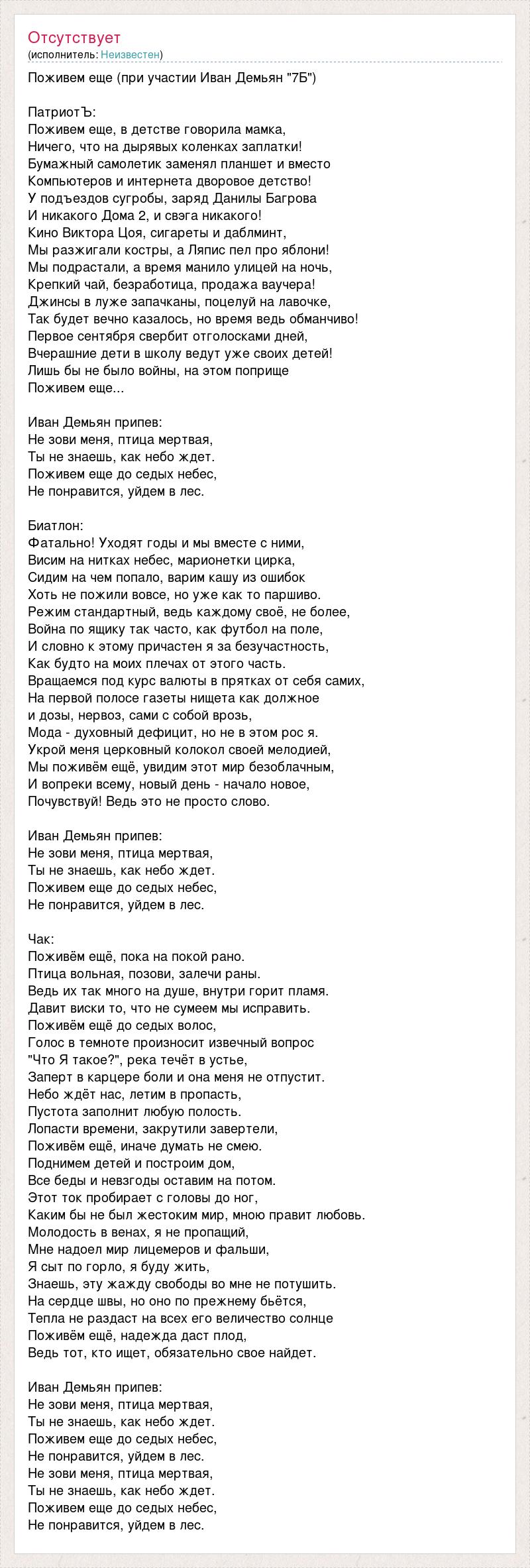 Поживем еще (при участии Иван Демьян "7Б") ПатриотЪ: Поживем еще, в детстве говорила мамка, Ничего, что на дырявых коленках заплатки! Бумажный самолетик заменял планшет и вместо Компьютеров и интернета дворовое детство! У подъездов сугробы, заряд Данилы Багрова И никакого Дома 2, и свэга никакого! Кино Виктора Цоя, сигареты и даблминт, Мы разжигали костры, а Ляпис пел про яблони! Мы подрастали, а время манило улицей на ночь, Крепкий чай, безработица, продажа ваучера! Джинсы в луже запачканы, поцелуй на лавочке, Так будет вечно казалось, но время ведь обманчиво! Первое сентября свербит отголосками дней, Вчерашние дети в школу ведут уже своих детей! Лишь бы не было войны, на этом поприще Поживем еще... Иван Демьян припев: Не зови меня, птица мертвая, Ты не знаешь, как небо ждет. Поживем еще до седых небес, Не понравится, уйдем в лес. Биатлон: Фатально! Уходят годы и мы вместе с ними, Висим на нитках небес, марионетки цирка, Сидим на чем попало, варим кашу из ошибок Хоть не пожили вовсе, но уже как то паршиво. Режим стандартный, ведь каждому своё, не более, Война по ящику так часто, как футбол на поле, И словно к этому причастен я за безучастность, Как будто на моих плечах от этого часть. Вращаемся под курс валюты в прятках от себя самих, На первой полосе газеты нищета как должное и дозы, нервоз, сами с собой врозь, Мода - духовный дефицит, но не в этом рос я. Укрой меня церковный колокол своей мелодией, Мы поживём ещё, увидим этот мир безоблачным, И вопреки всему, новый день - начало новое, Почувствуй! Ведь это не просто слово. Иван Демьян припев: Не зови меня, птица мертвая, Ты не знаешь, как небо ждет. Поживем еще до седых небес, Не понравится, уйдем в лес. Чак: Поживём ещё, пока на покой рано. Птица вольная, позови, залечи раны. Ведь их так много на душе, внутри горит пламя. Давит виски то, что не сумеем мы исправить. Поживём ещё до седых волос, Голос в темноте произносит извечный вопрос "Что Я такое?", река течёт в устье, Заперт в карцере боли и она меня не отпустит. Небо ждёт нас, летим в пропасть, Пустота заполнит любую полость. Лопасти времени, закрутили завертели, Поживём ещё, иначе думать не смею. Поднимем детей и построим дом, Все беды и невзгоды оставим на потом. Этот ток пробирает с головы до ног, Каким бы не был жестоким мир, мною правит любовь. Молодость в венах, я не пропащий, Мне надоел мир лицемеров и фальши, Я сыт по горло, я буду жить, Знаешь, эту жажду свободы во мне не потушить. На сердце швы, но оно по прежнему бьётся, Тепла не раздаст на всех его величество солнце Поживём ещё, надежда даст плод, Ведь тот, кто ищет, обязательно свое найдет. Иван Демьян припев: Не зови меня, птица мертвая, Ты не знаешь, как небо ждет. Поживем еще до седых небес, Не понравится, уйдем в лес. Не зови меня, птица мертвая, Ты не знаешь, как небо ждет. Поживем еще до седых небес, Не понравится, уйдем в лес.